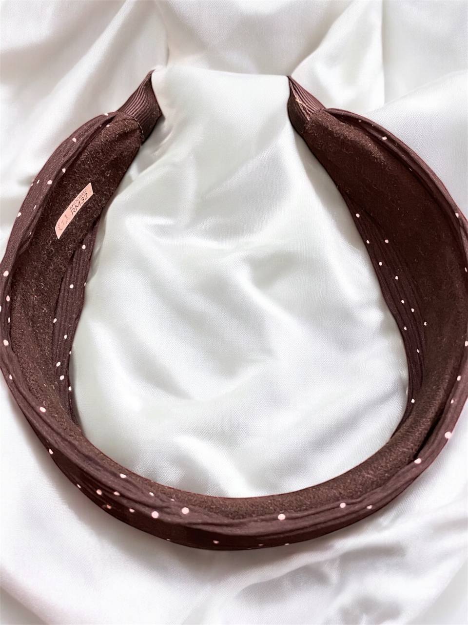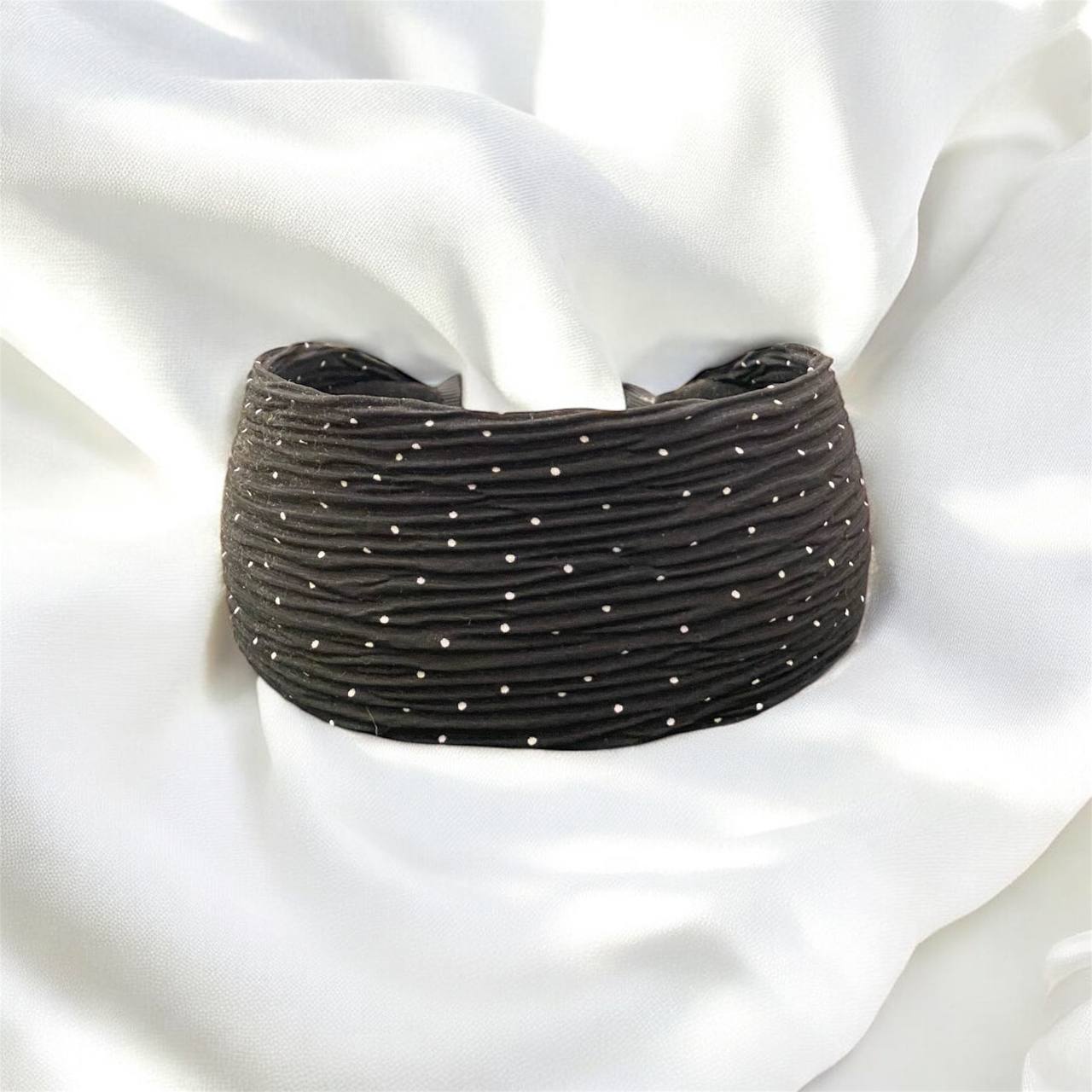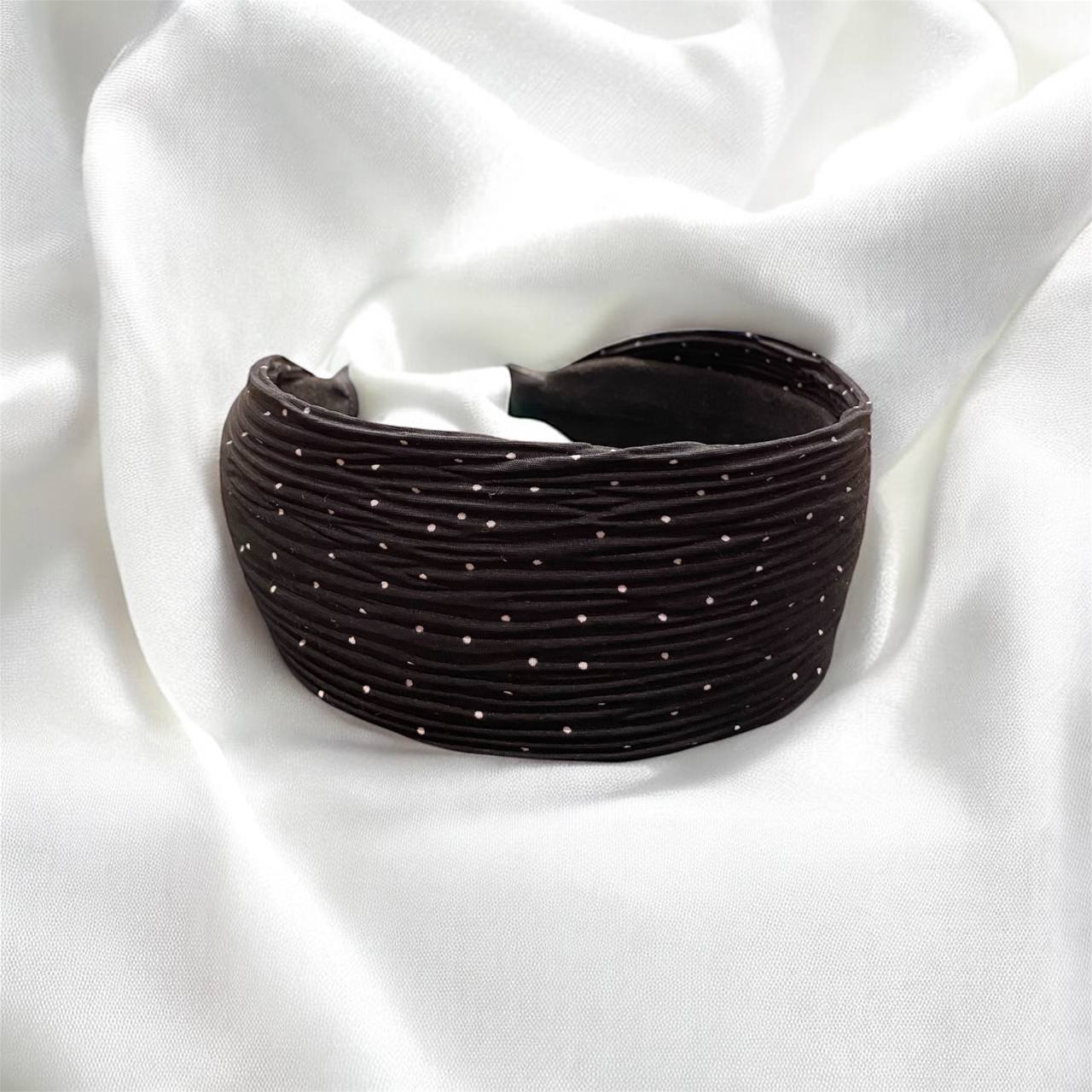 Black headband adorned with subtle white bead detailing, adding a touch of elegance to any look.