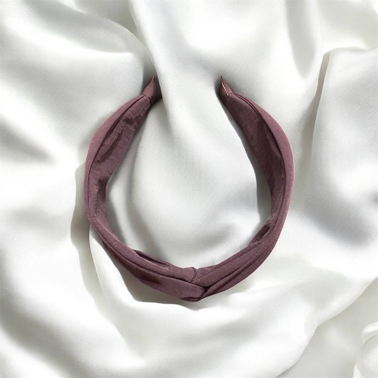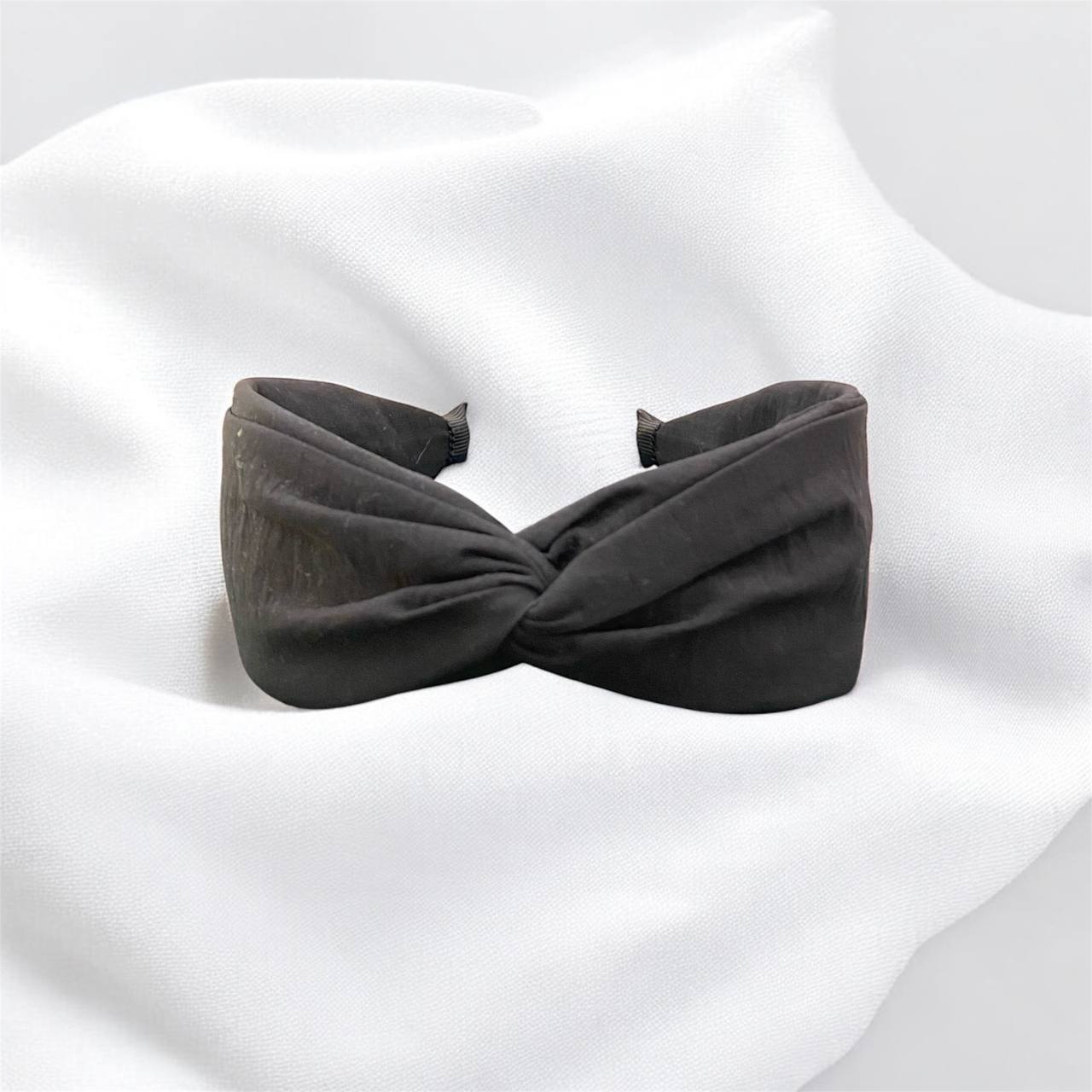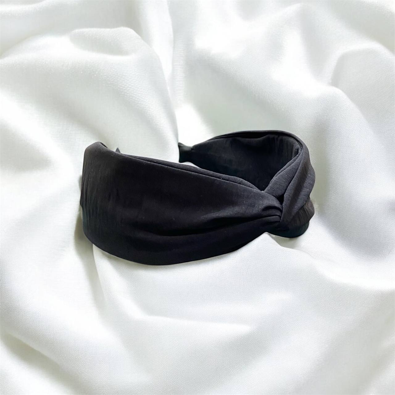 Black headband featuring a slight center knot, offering a clean and chic look with effortless simplicity.