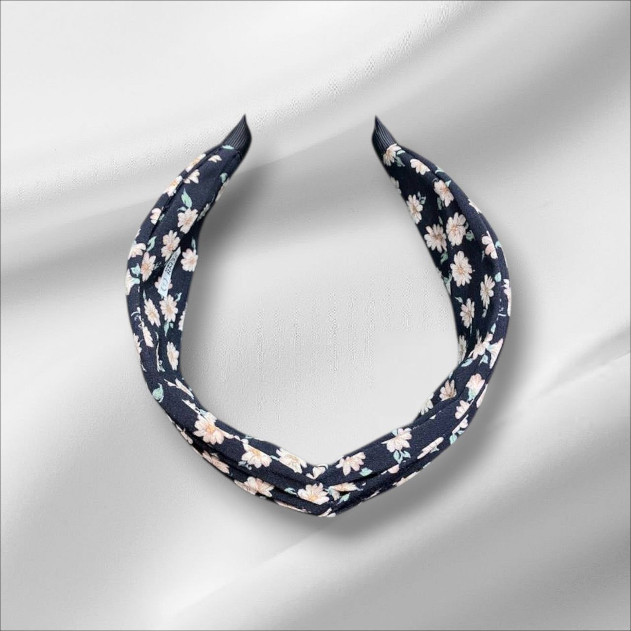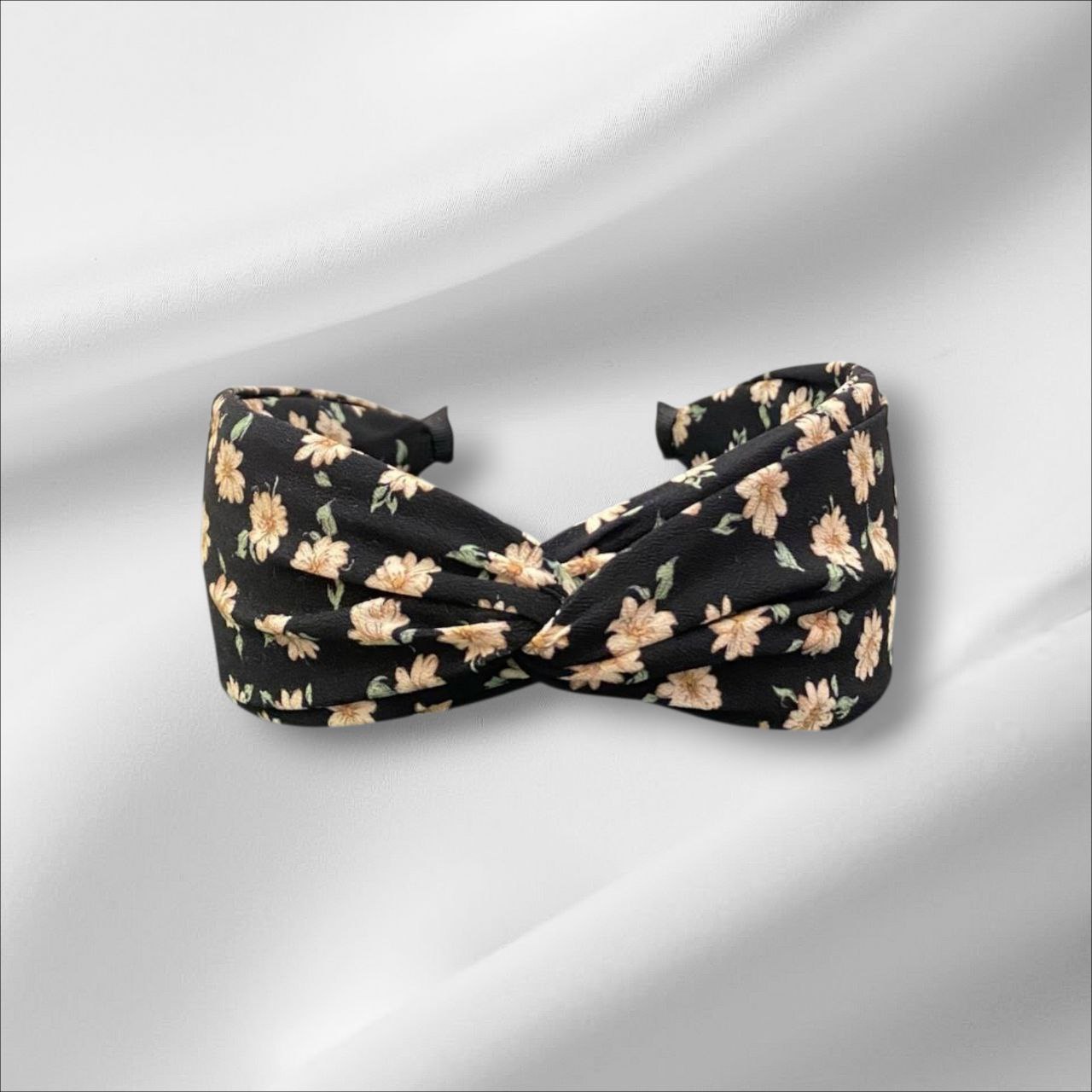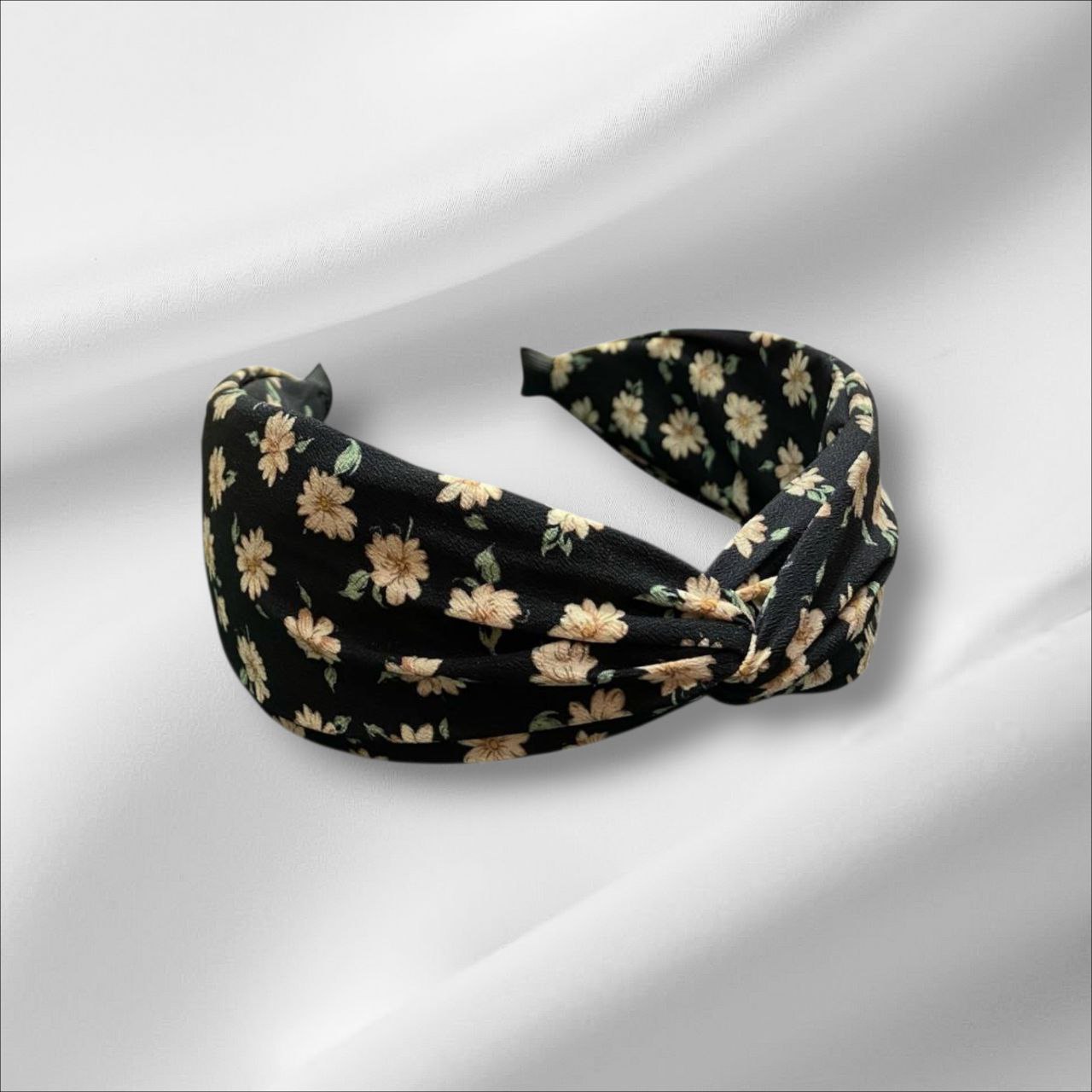 Black headband accented with delicate white floral detailing, adding a soft and feminine touch to any outfit.