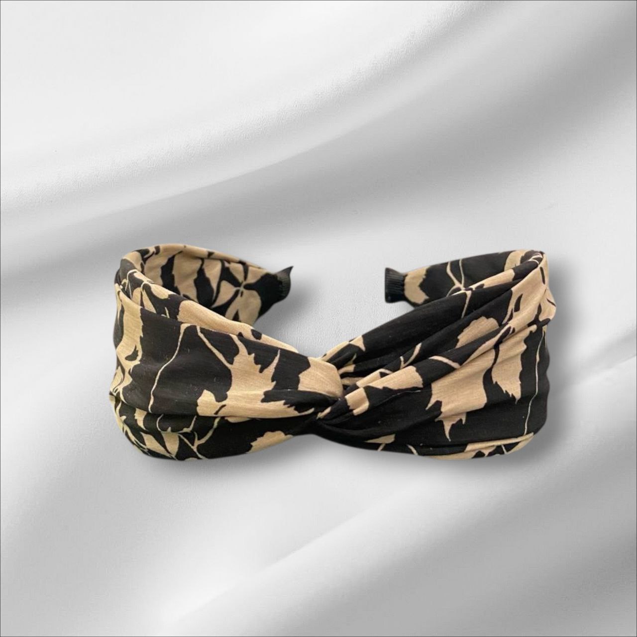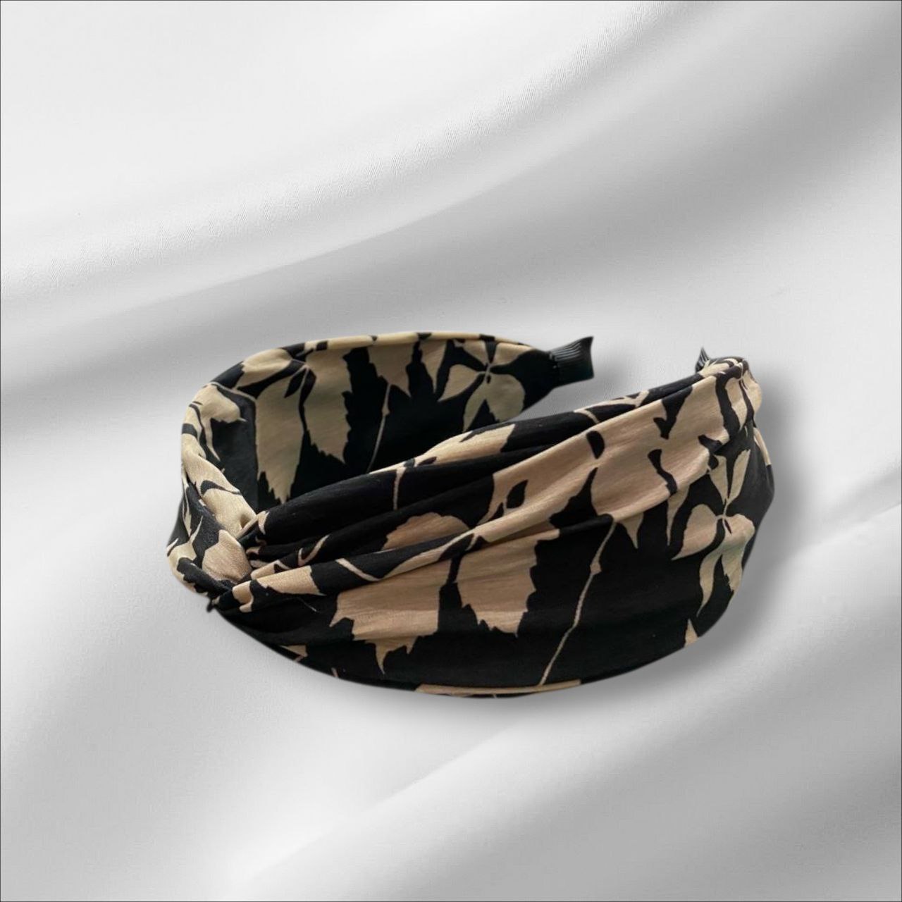 A black headband accented with soft beige leaf-like patterns, featuring a stylish front twist that adds a touch of effortless elegance.