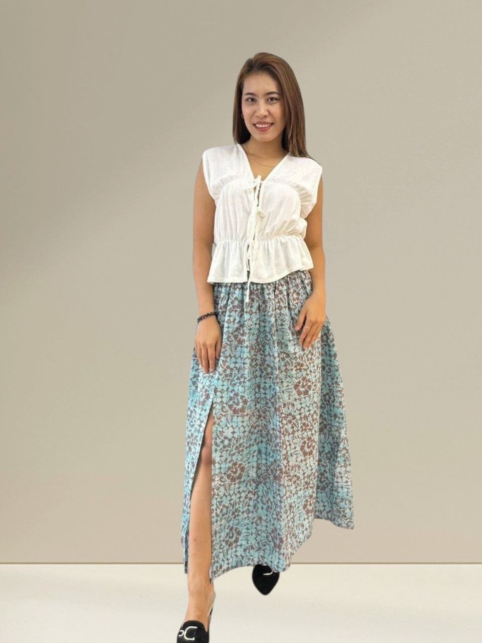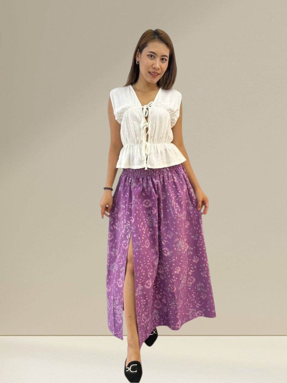 This Tropical Batik Skirt features a relaxed, flowy silhouette with vibrant tropical-inspired batik patterns that add a playful yet elegant touch. Designed with a fully elastic waistband, it provides a comfortable and flexible fit that flatters the waist while allowing ease of movement. The ankle-length cut is complemented by a side slit, adding subtle movement and a touch of femininity while allowing ease of walking. Crafted from lightweight, breathable fabric, this skirt drapes beautifully and is perfect for warm-weather styling, casual outings, or relaxed festive occasions. Measurements: Waist: Free Size Length: 101cm IMPORTANT NOTE: The actual product may vary slightly from the images shown due to studio lighting and individual screen color settings.