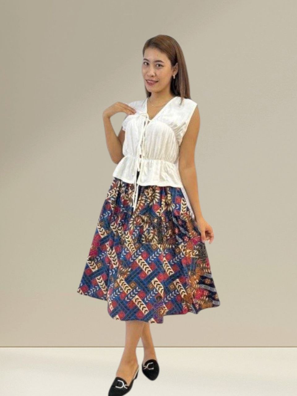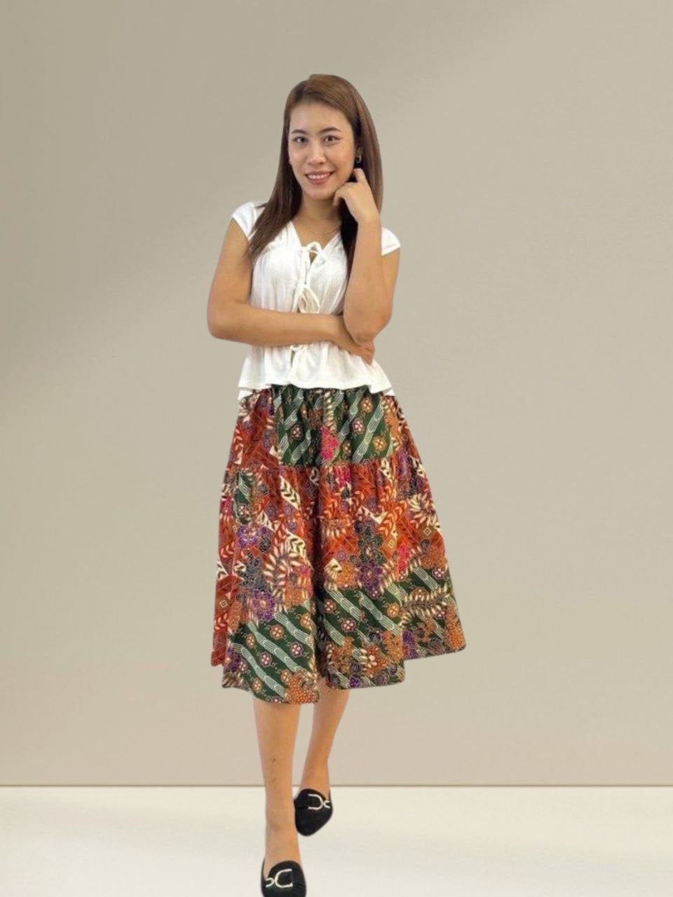 This Batik Skirt features a relaxed, flowy silhouette with vibrant tropical-inspired batik patterns that add a playful yet elegant touch. Designed with a fully elastic waistband, it provides a comfortable and flexible fit that flatters the waist while allowing ease of movement. The mid-length cut creates a graceful drape, making it perfect for everyday wear, casual outings, or holiday styling. Crafted from lightweight and breathable fabric, this skirt is ideal for warm weather and all-day comfort. Measurements: Waist: Free size Length: 75cm IMPORTANT NOTE: The actual product may vary slightly from the images shown due to studio lighting and individual screen color settings.