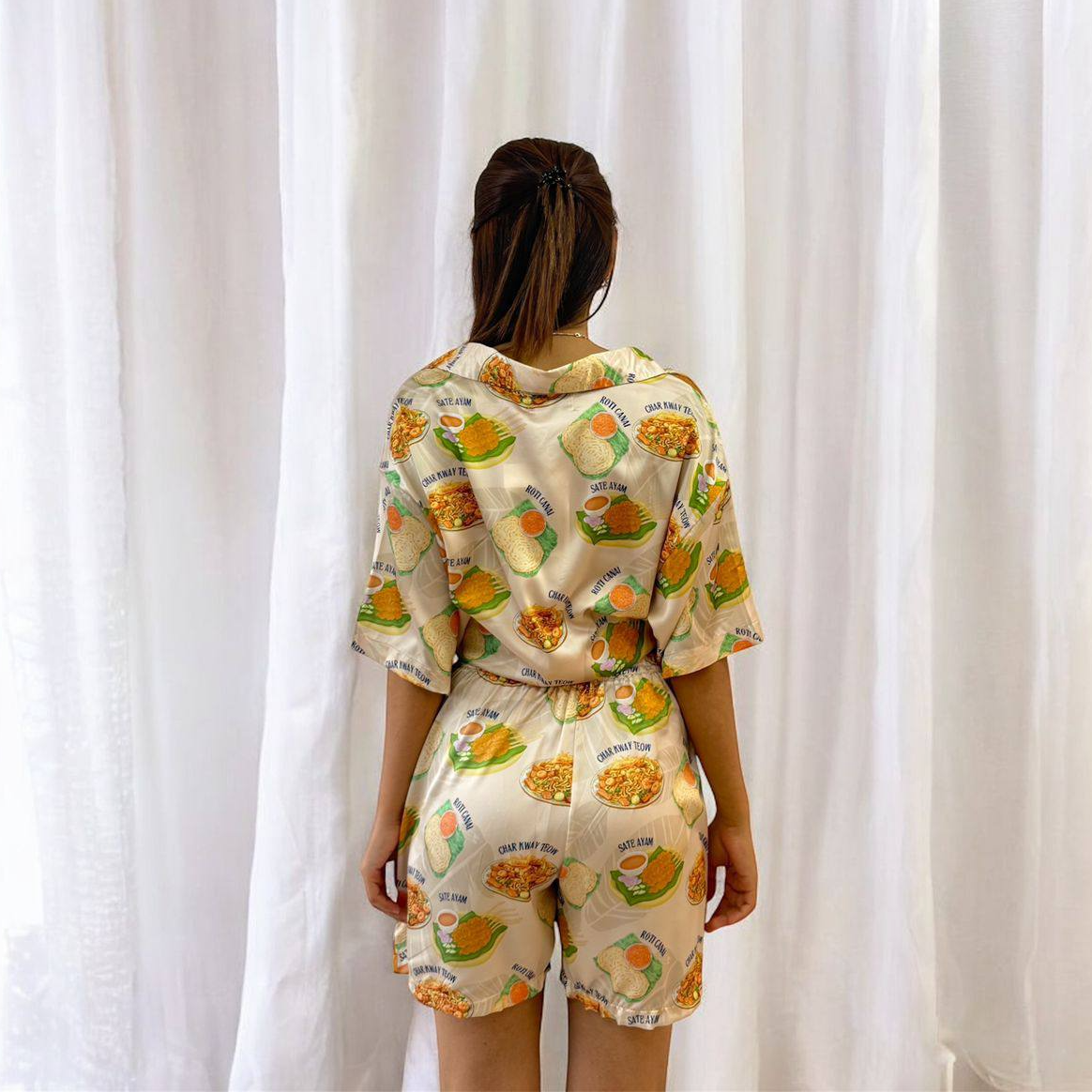 Malaysian Food Hawaiian Shirt Craving some style? Feast your eyes on our Malaysian Food Hawaiian Shirt! Crafted from ultra-smooth, high-quality satin fabric, this shirt offers exceptional comfort with a glossy, stylish finish that feels fantastic against your skin. Featuring a mouthwatering all-over print of iconic Malaysian dishes like Nasi Lemak, Char Kuey Teow, and Satay Ayam artfully scattered on a soft cream background, this shirt brings a delicious touch of local culinary culture to your wardrobe. The vibrant depictions of these beloved meals create a visually appetizing and unique look that's sure to spark conversations about your favorite eats. Material: Soft, and breathable fabric Design: All-over print of popular Malaysian dishes Feel: Lightweight, silky, and undeniably delectable Whether you're a local with a deep appreciation for Malaysian food or simply someone who enjoys a unique and eye-catching design, this shirt offers the perfect blend of comfort and flavorful visual appeal. IMPORTANT NOTE: The item may appear slightly different from the pictures shown due to studio lighting conditions and variations in device screen color calibration.