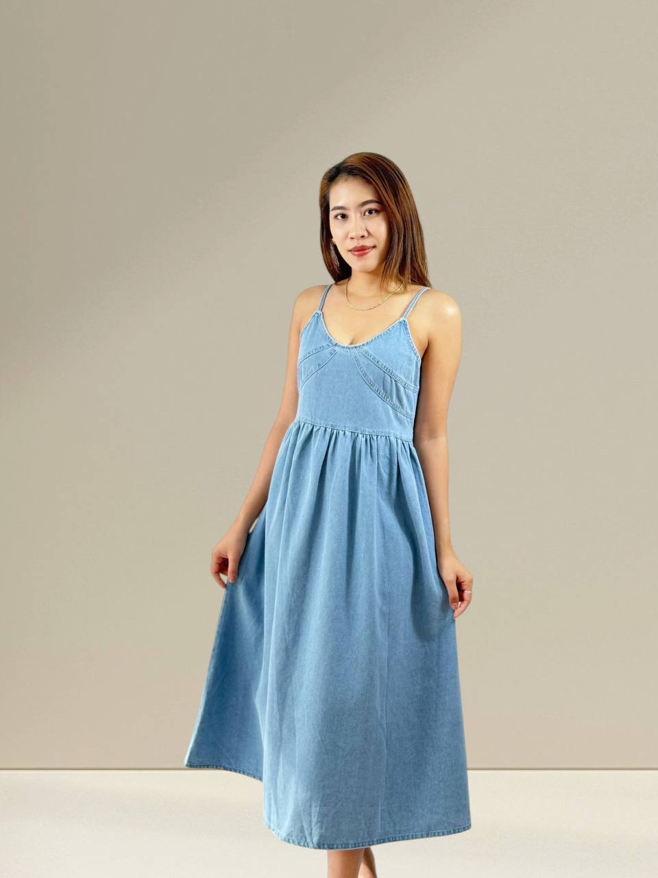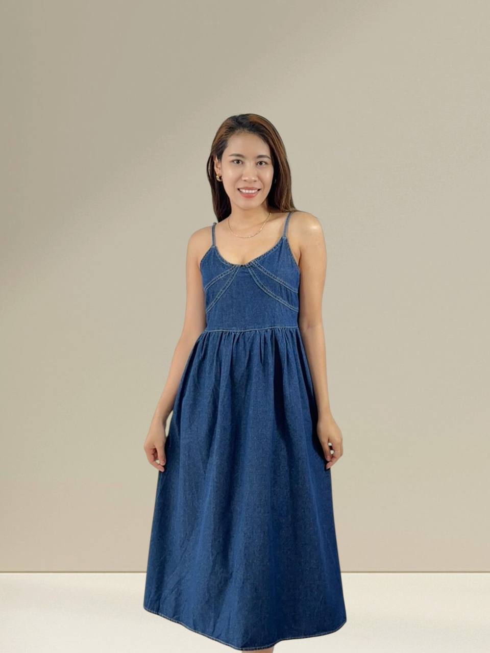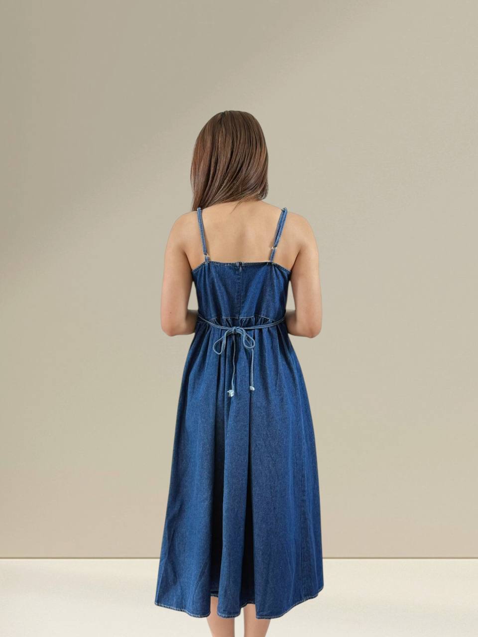 Denim midi dress is designed with a timeless, minimalist aesthetic that blends comfort and effortless style. It features delicate straps and a soft V-neckline that beautifully frame the neckline while giving a feminine and airy feel. The bodice is gently fitted to enhance the natural silhouette, with subtle seam detailing that adds structure without looking heavy. From the waist down, the skirt flows into a relaxed, flared midi length, creating elegant movement with every step.