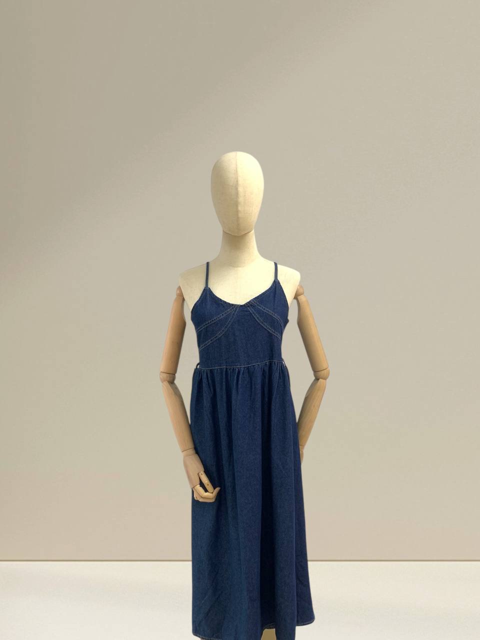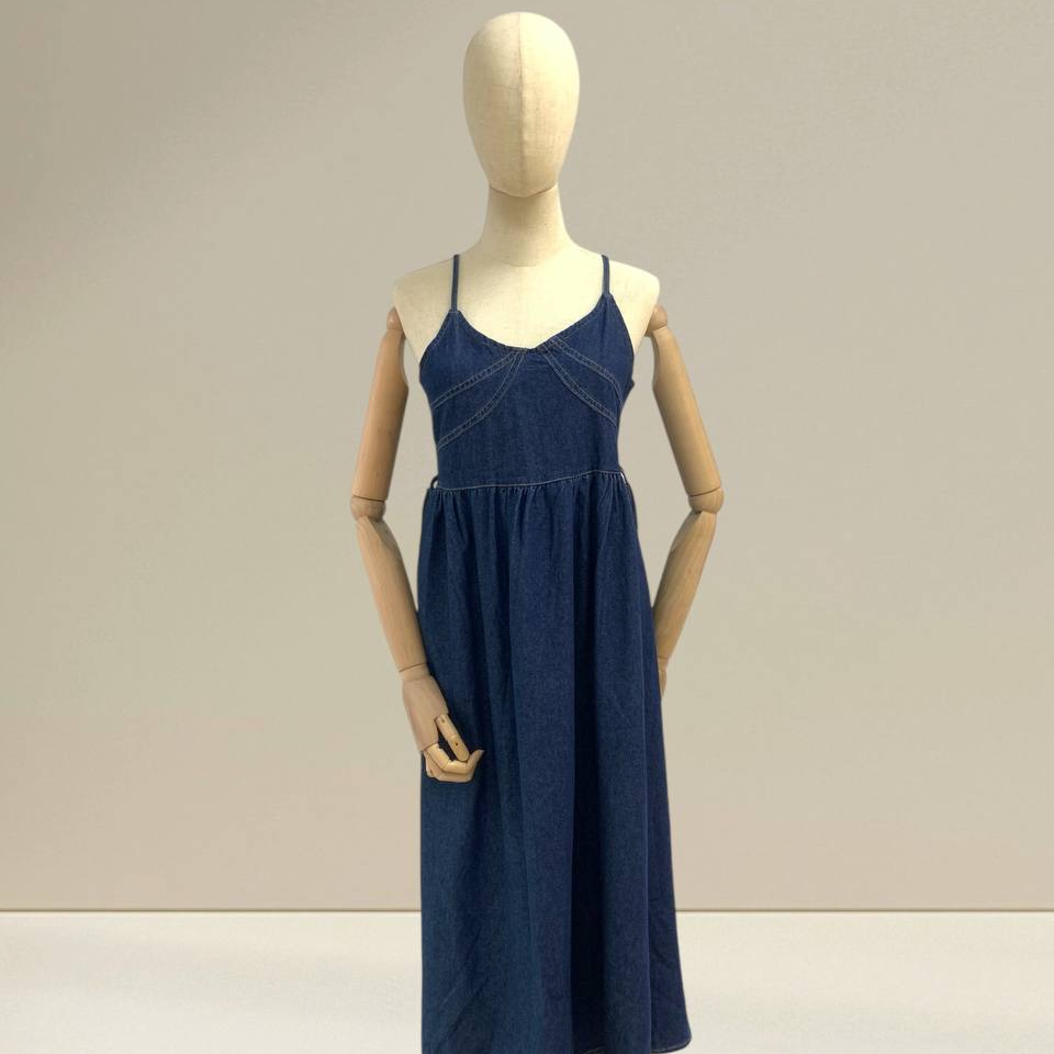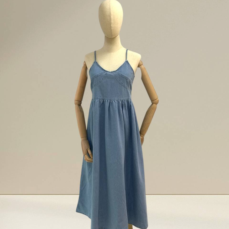 Denim midi dress is designed with a timeless, minimalist aesthetic that blends comfort and effortless style. It features delicate straps and a soft V-neckline that beautifully frame the neckline while giving a feminine and airy feel. The bodice is gently fitted to enhance the natural silhouette, with subtle seam detailing that adds structure without looking heavy. From the waist down, the skirt flows into a relaxed, flared midi length, creating elegant movement with every step. Crafted from lightweight, breathable denim fabric, this dress feels soft on the skin and is comfortable for all-day wear. The fabric drapes naturally, making it suitable for warm weather while still offering enough structure to look polished. Its versatile design allows it to be styled casually with sandals for daytime outings, or elevated with heels and accessories for a more refined look. Perfect for everyday wear, brunch dates, or relaxed gatherings, this denim midi dress is a wardrobe essential that never goes out of style. Sizes in centimeter Measurements: Bust: 86 cm Length: 125 cm IMPORTANT NOTE: The actual product may vary slightly from the images shown due to studio lighting and individual screen color settings.