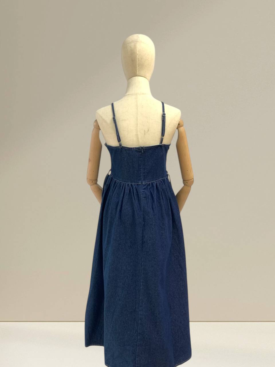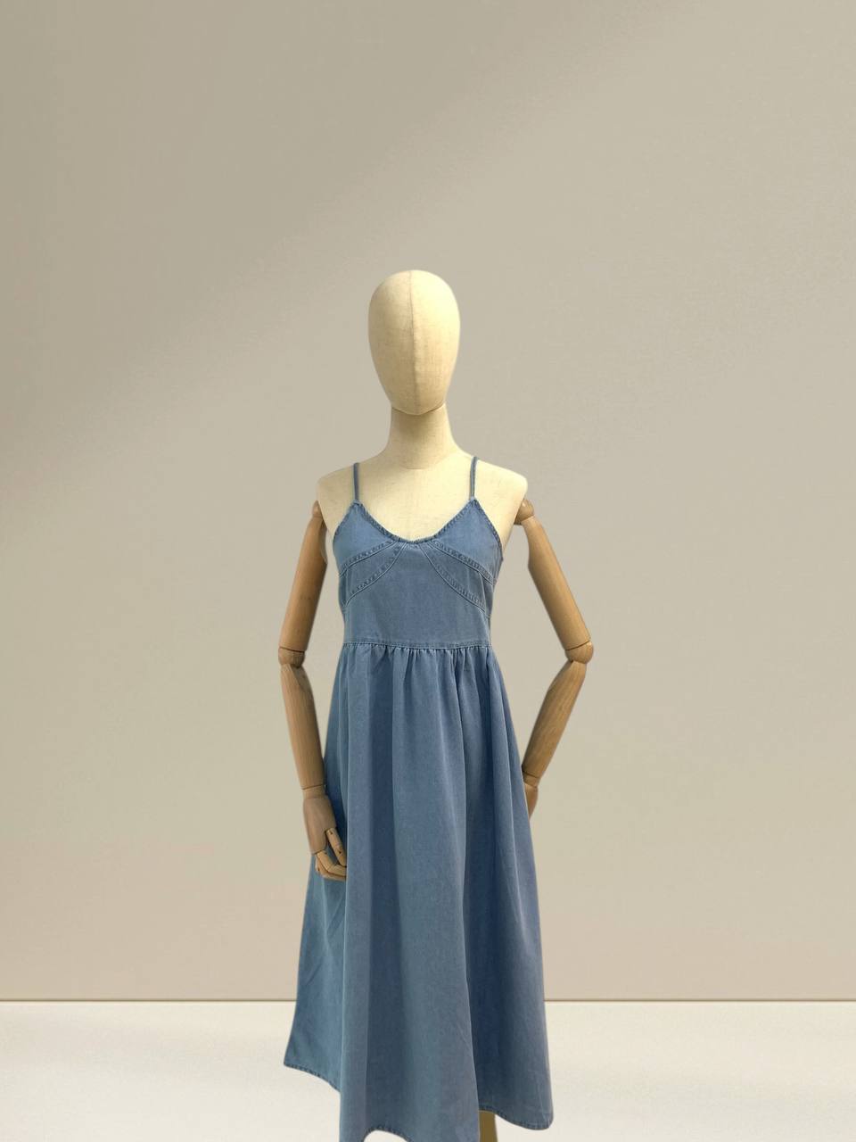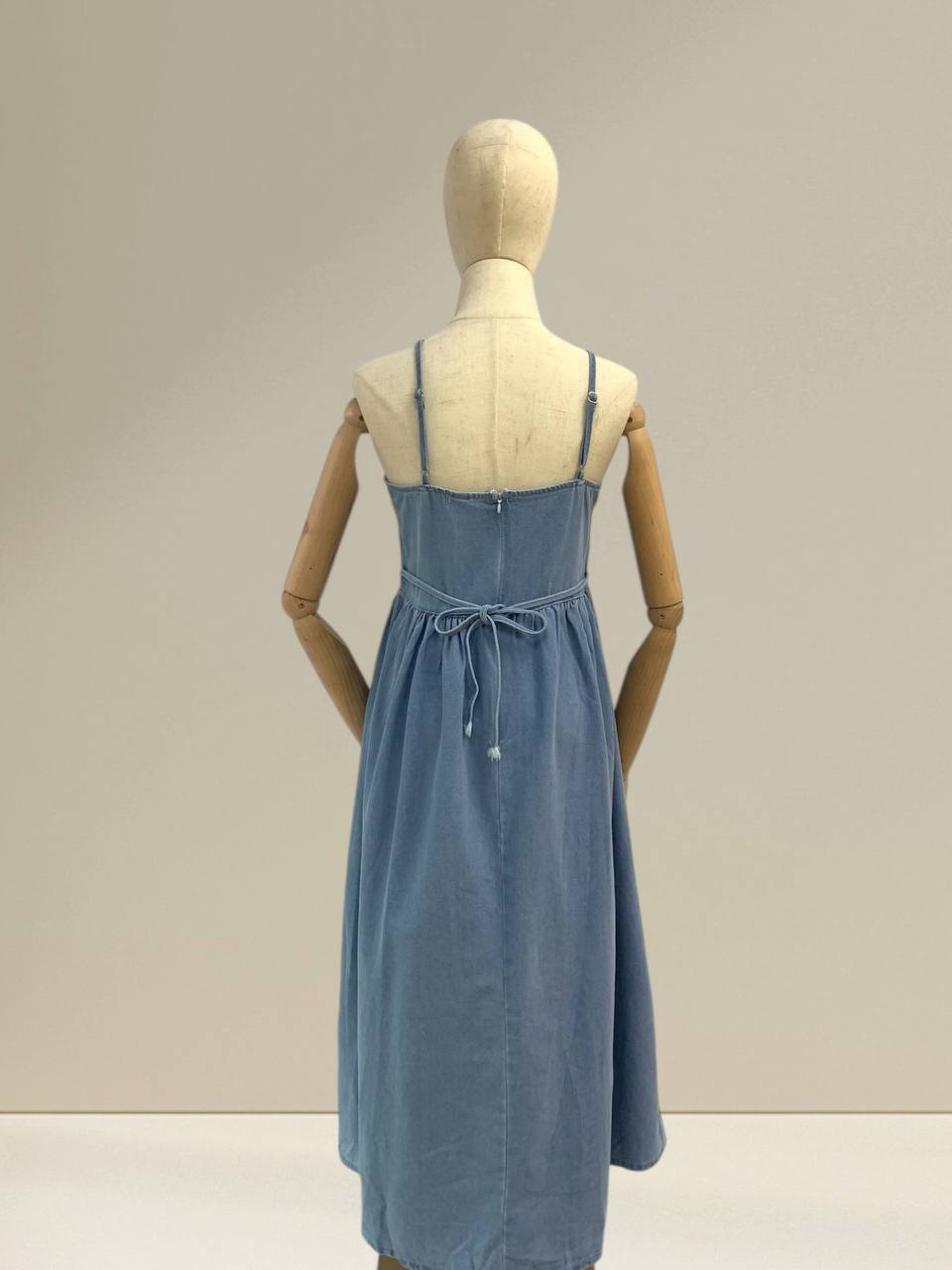 Denim midi dress is designed with a timeless, minimalist aesthetic that blends comfort and effortless style. It features delicate straps and a soft V-neckline that beautifully frame the neckline while giving a feminine and airy feel. The bodice is gently fitted to enhance the natural silhouette, with subtle seam detailing that adds structure without looking heavy. From the waist down, the skirt flows into a relaxed, flared midi length, creating elegant movement with every step. Crafted from lightweight, breathable denim fabric, this dress feels soft on the skin and is comfortable for all-day wear. The fabric drapes naturally, making it suitable for warm weather while still offering enough structure to look polished. Its versatile design allows it to be styled casually with sandals for daytime outings, or elevated with heels and accessories for a more refined look. Perfect for everyday wear, brunch dates, or relaxed gatherings, this denim midi dress is a wardrobe essential that never goes out of style. Sizes in centimeter Measurements: Bust: 86 cm Length: 125 cm IMPORTANT NOTE: The actual product may vary slightly from the images shown due to studio lighting and individual screen color settings.