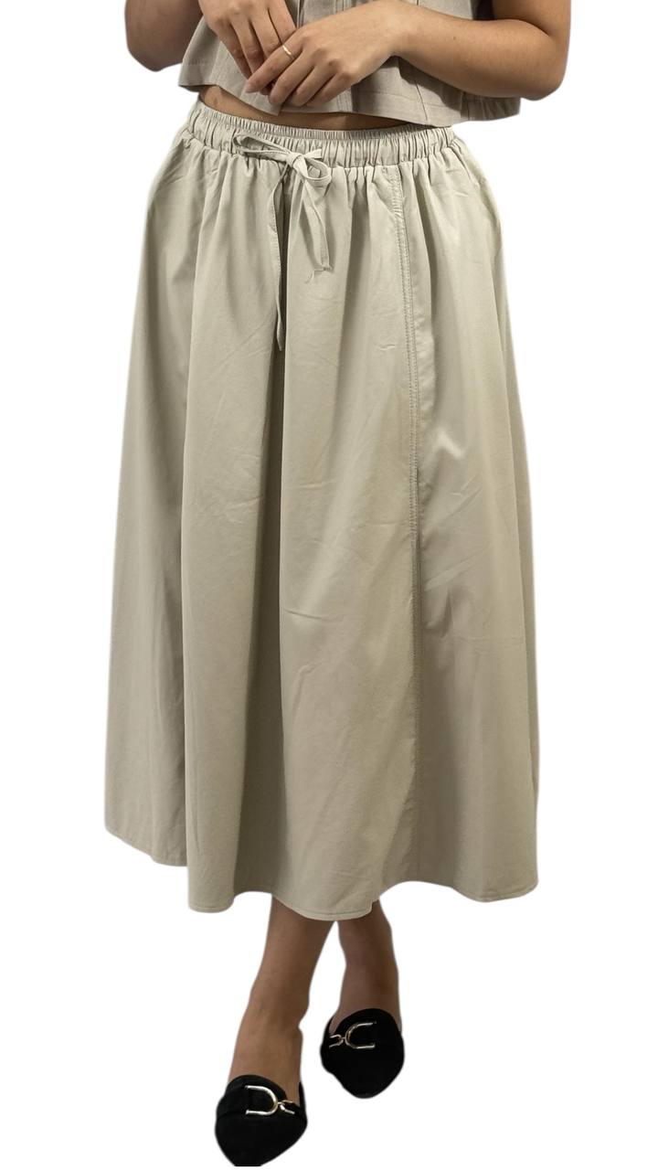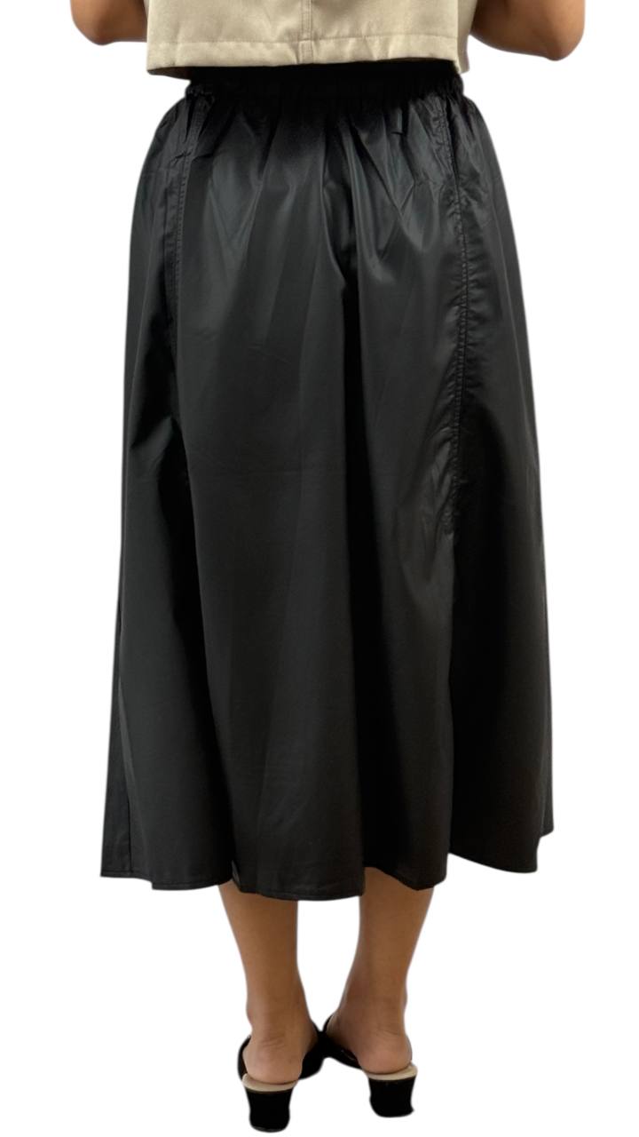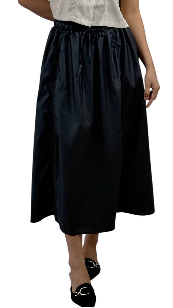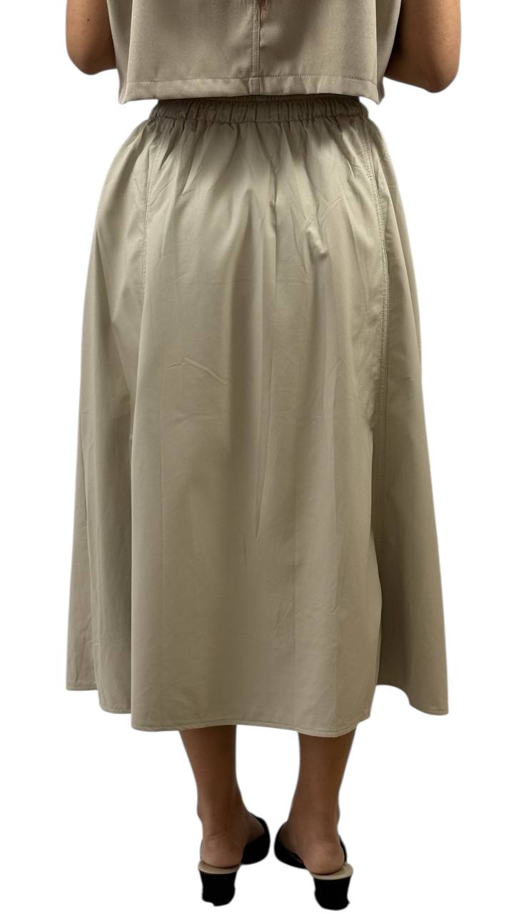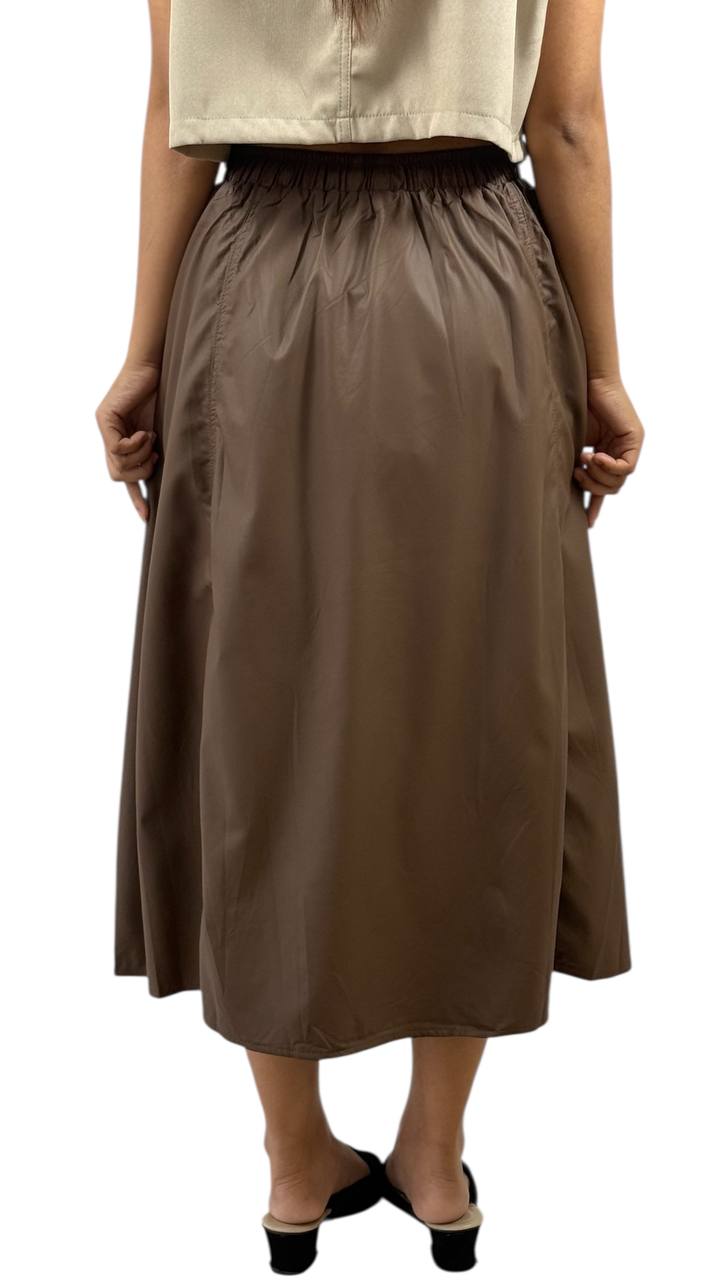 A chic and versatile midi skirt that hits gracefully mid calf, perfect for both casual and semi-formal occasions. Crafted from soft, lightweight fabric, it offers comfort and ease of movement. Features a flattering A-line silhouette with subtle pleats, an elastic or fitted waistband for a snug fit, and a flowy drape that adds effortless elegance to any outfit. Pair it with a tucked-in blouse, tee or knitwear for a polished look.