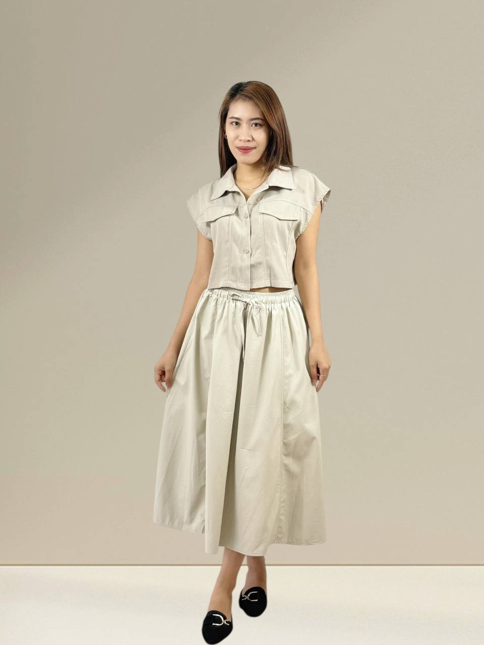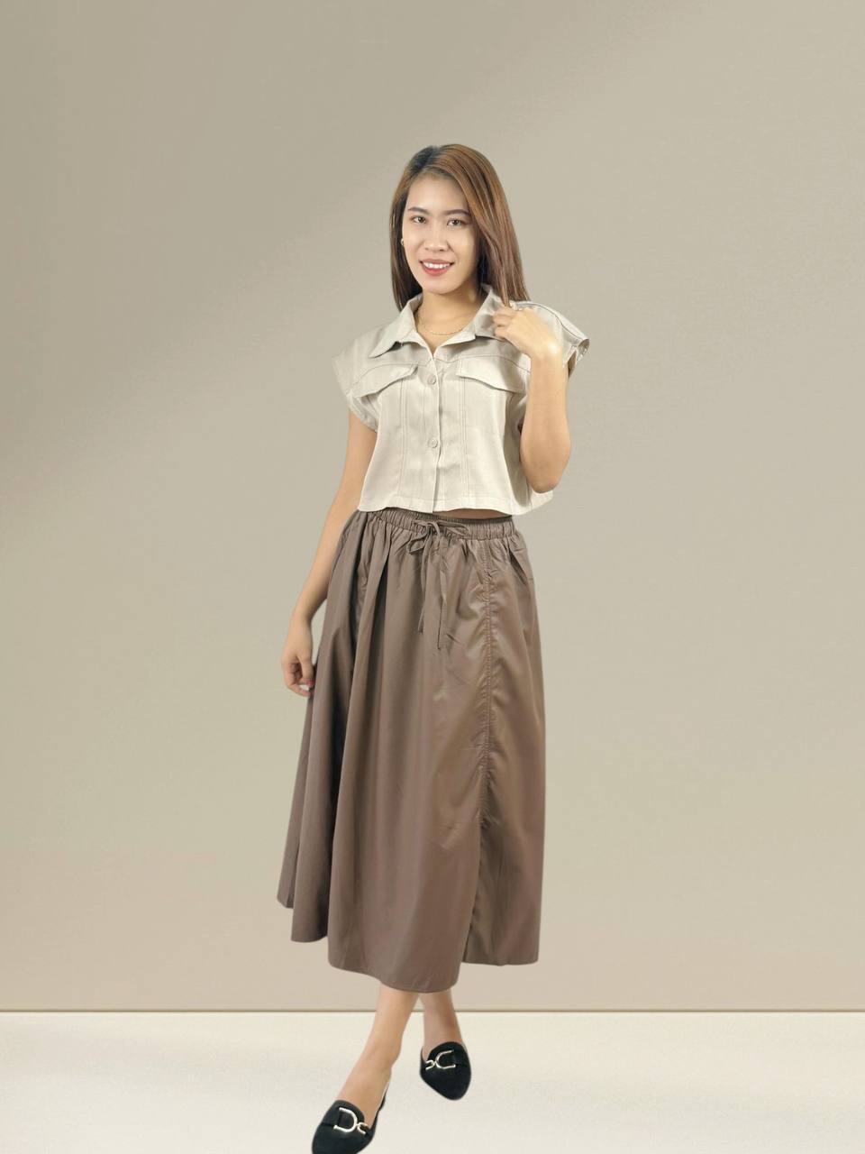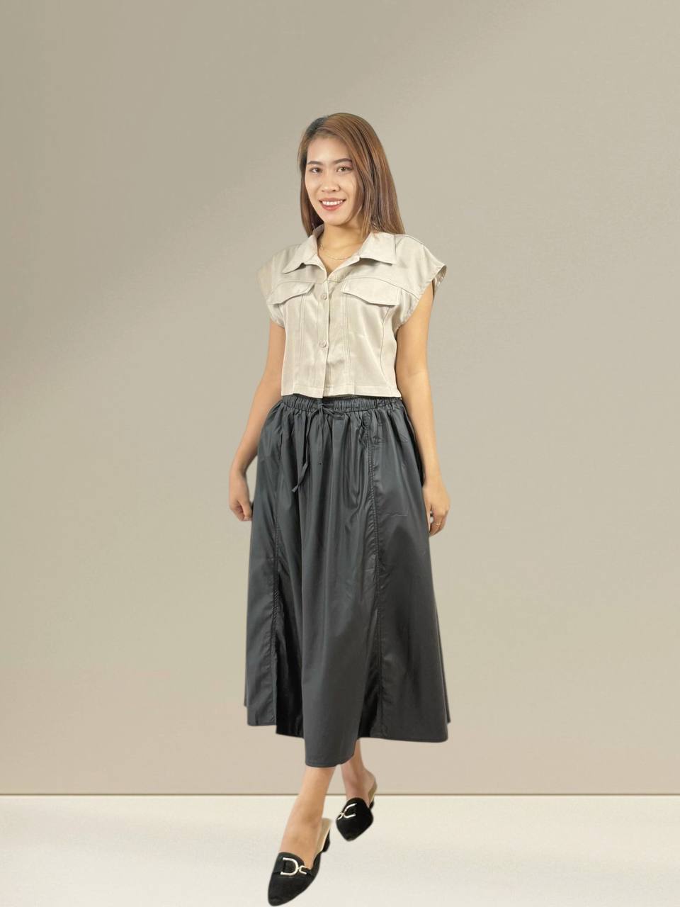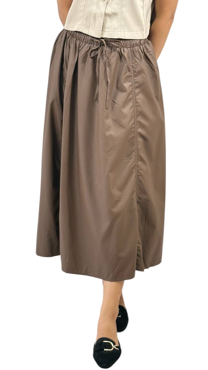 A chic and versatile midi skirt that hits gracefully mid calf, perfect for both casual and semi-formal occasions. Crafted from soft, lightweight fabric, it offers comfort and ease of movement. Features a flattering A-line silhouette with subtle pleats, an elastic or fitted waistband for a snug fit, and a flowy drape that adds effortless elegance to any outfit. Pair it with a tucked-in blouse, tee or knitwear for a polished look.