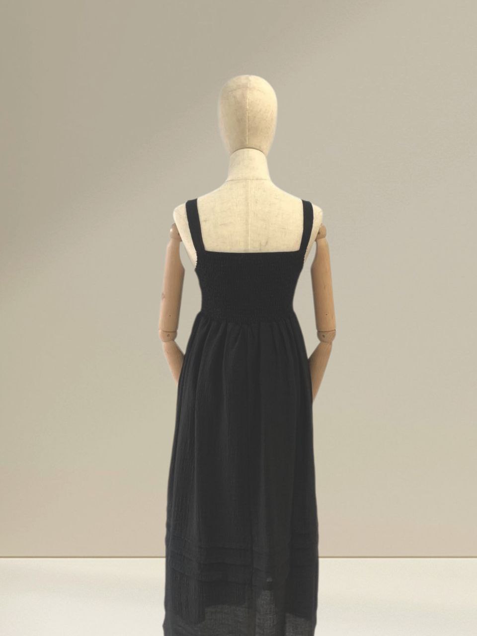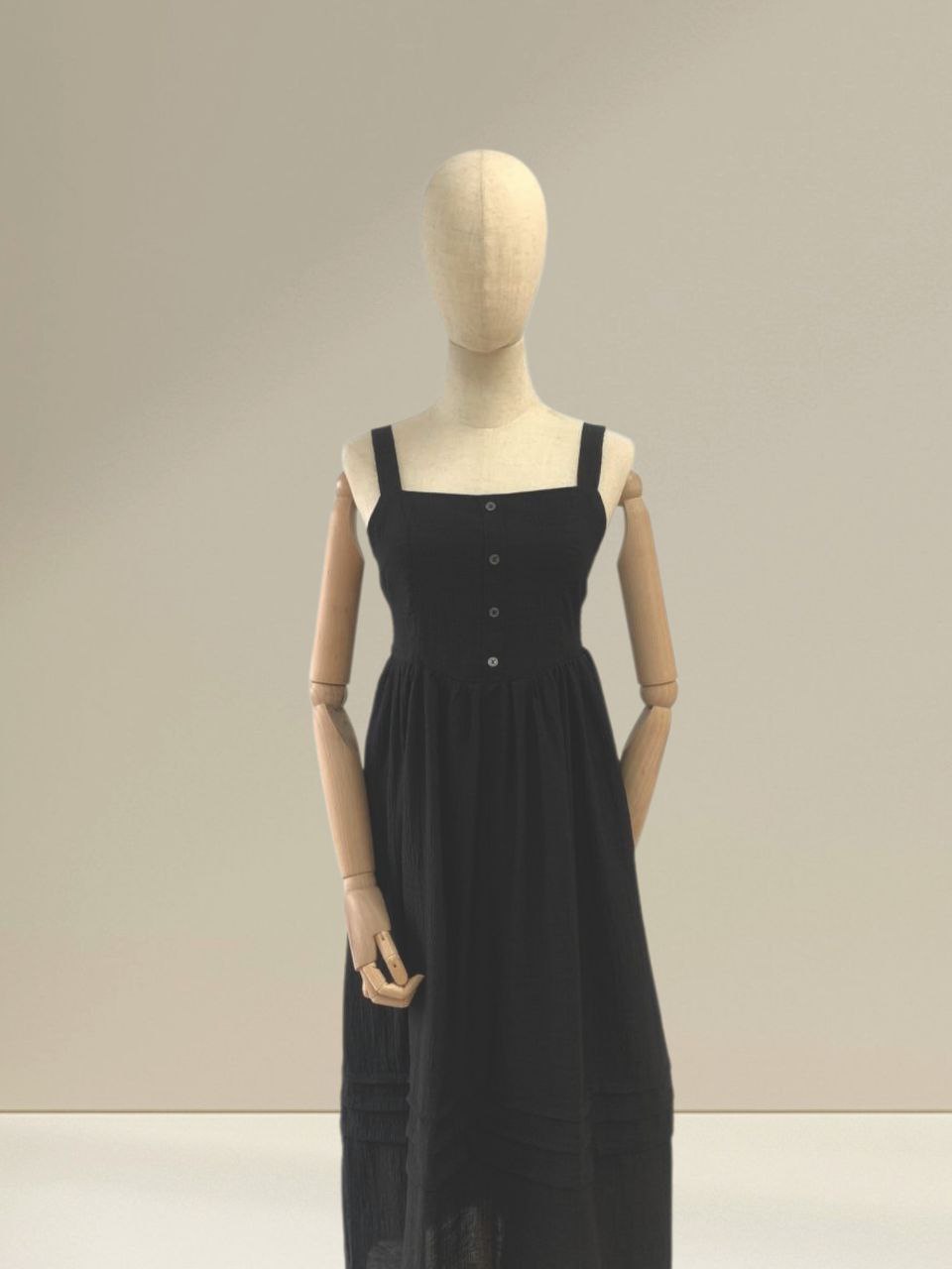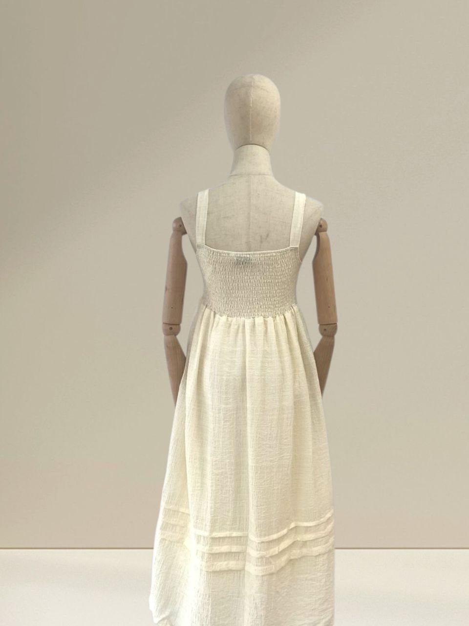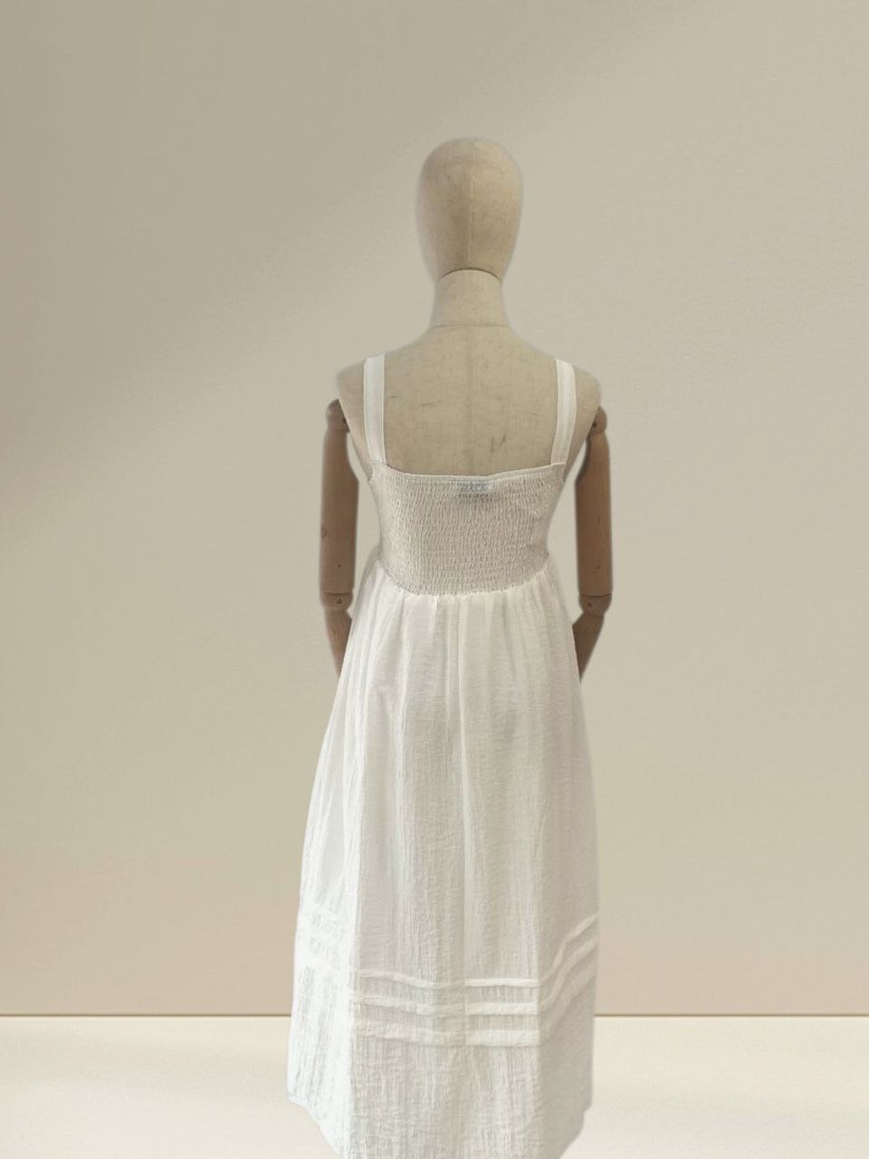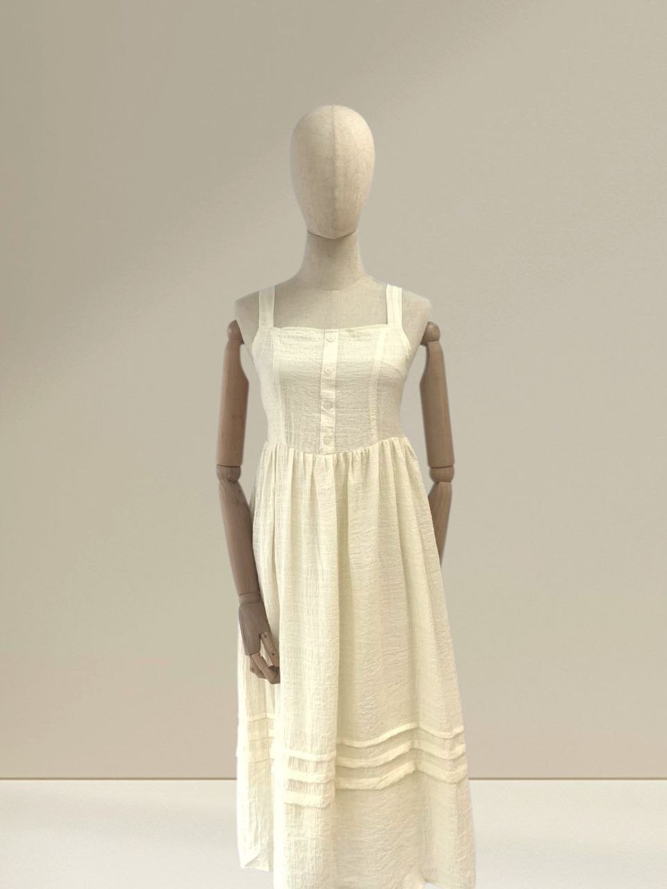 A soft and feminine white midi dress crafted from lightweight textured fabric for an effortlessly elegant look. Designed with delicate shoulder straps, a button-down front, and a gently gathered waist that flows into a relaxed silhouette. The breathable material and airy cut make it perfect for warm days, casual outings, or a minimal chic look. Easy to style with sandals or flats for a timeless, graceful outfit. Measurements: Bust: 72cm Waist: 76cm Length: 113cm IMPORTANT NOTE: The actual product may vary slightly from the images shown due to studio lighting and individual screen color settings.