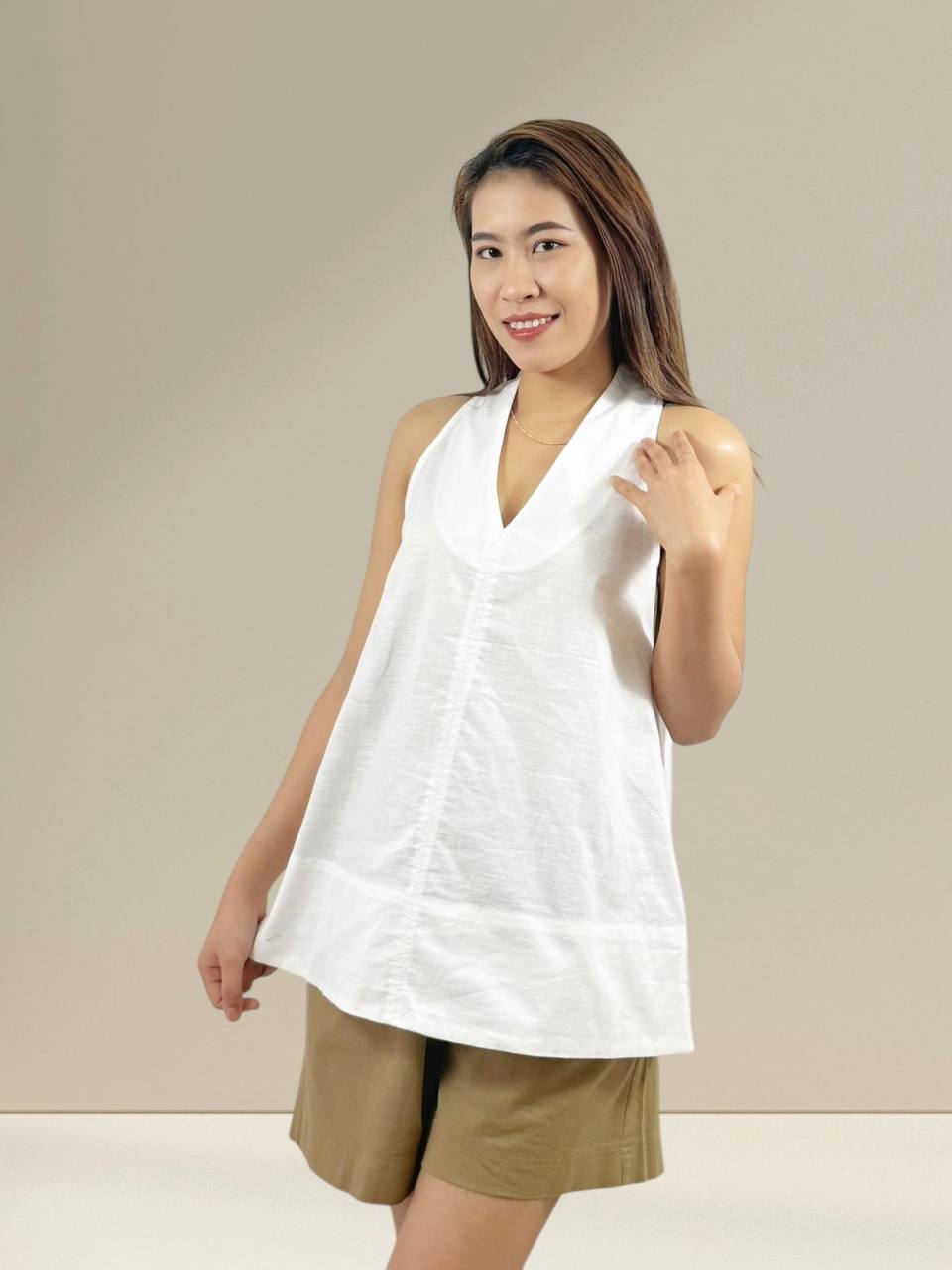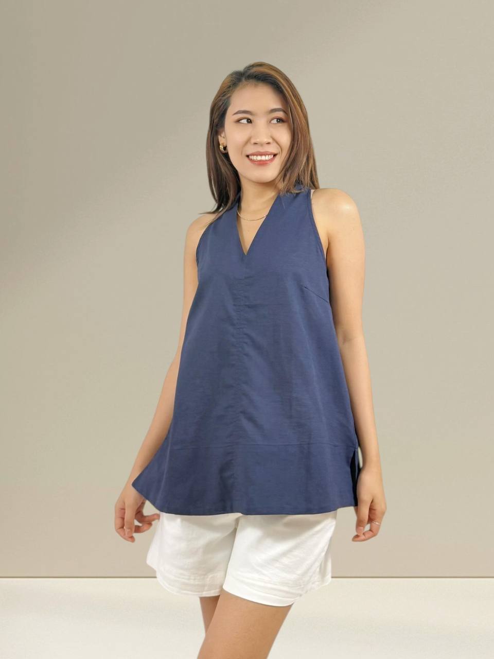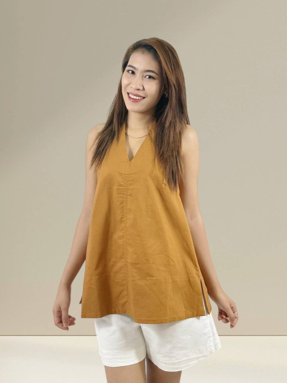 A relaxed sleeveless tunic designed for effortless everyday wear. Features a loose, flowy silhouette with soft gathers that offer comfort and ease of movement. Made from lightweight, breathable fabric, perfect to pair with skirts or pants for a casual and laid-back look. Suitable for daily wear and warm weather. Measurements : Bust: 90cm Length: 71cm IMPORTANT NOTE: The actual product may vary slightly from the images shown due to studio lighting and individual screen color settings.