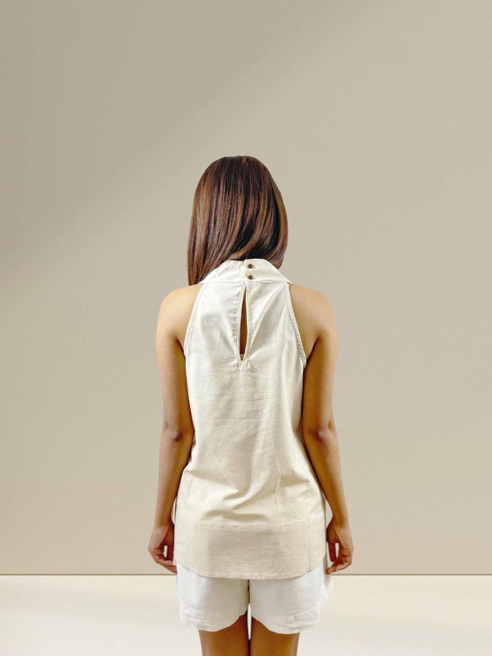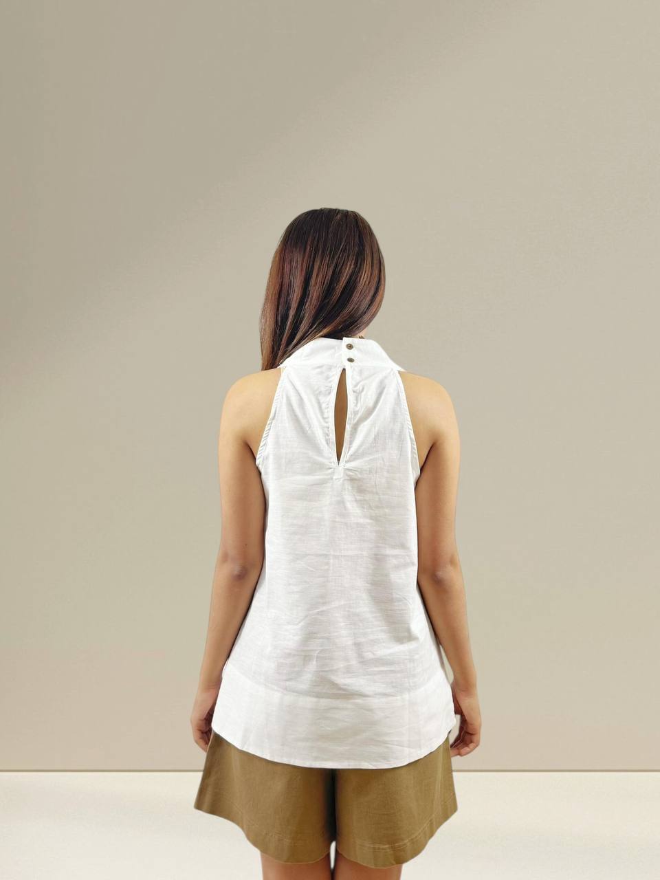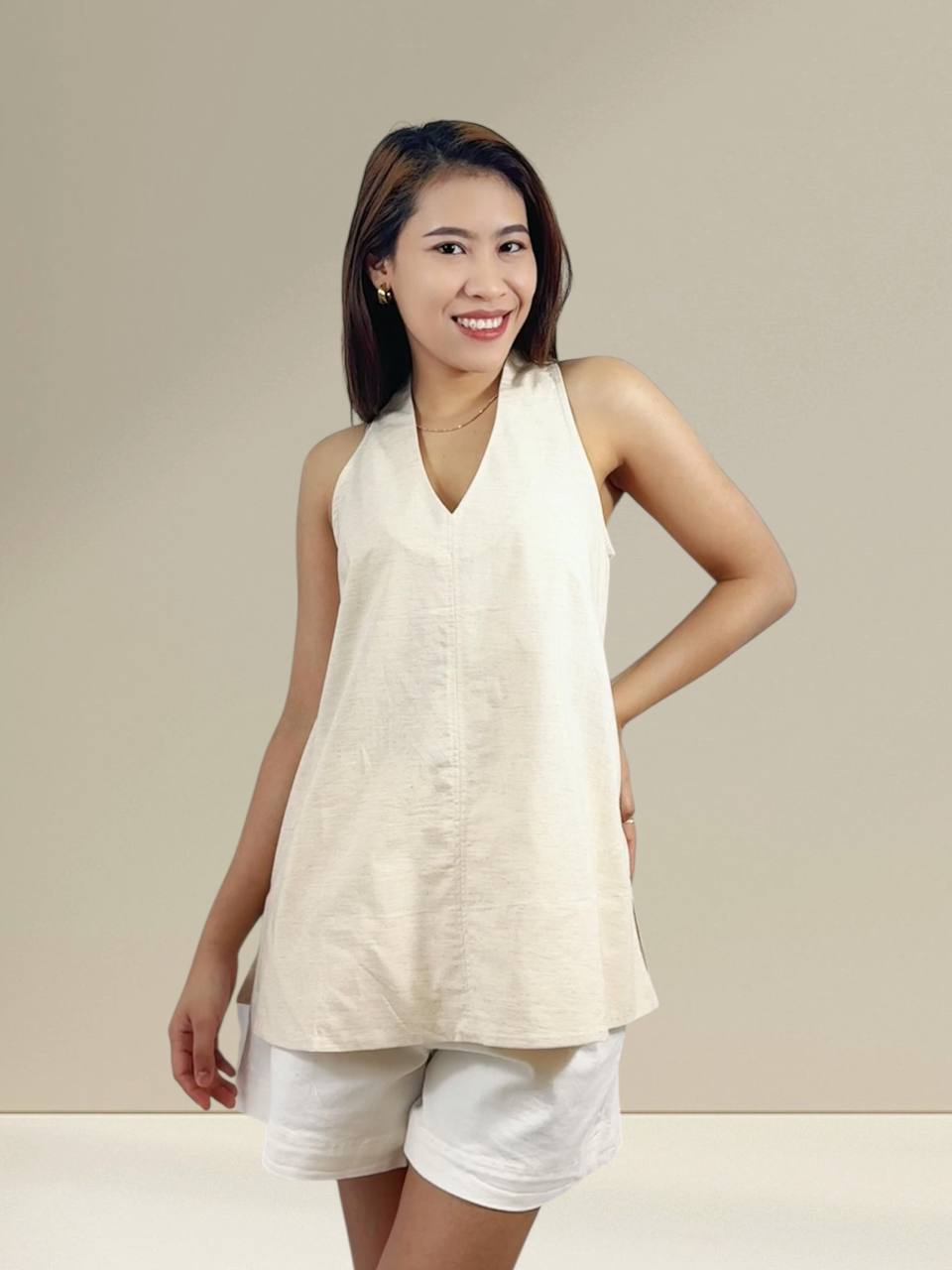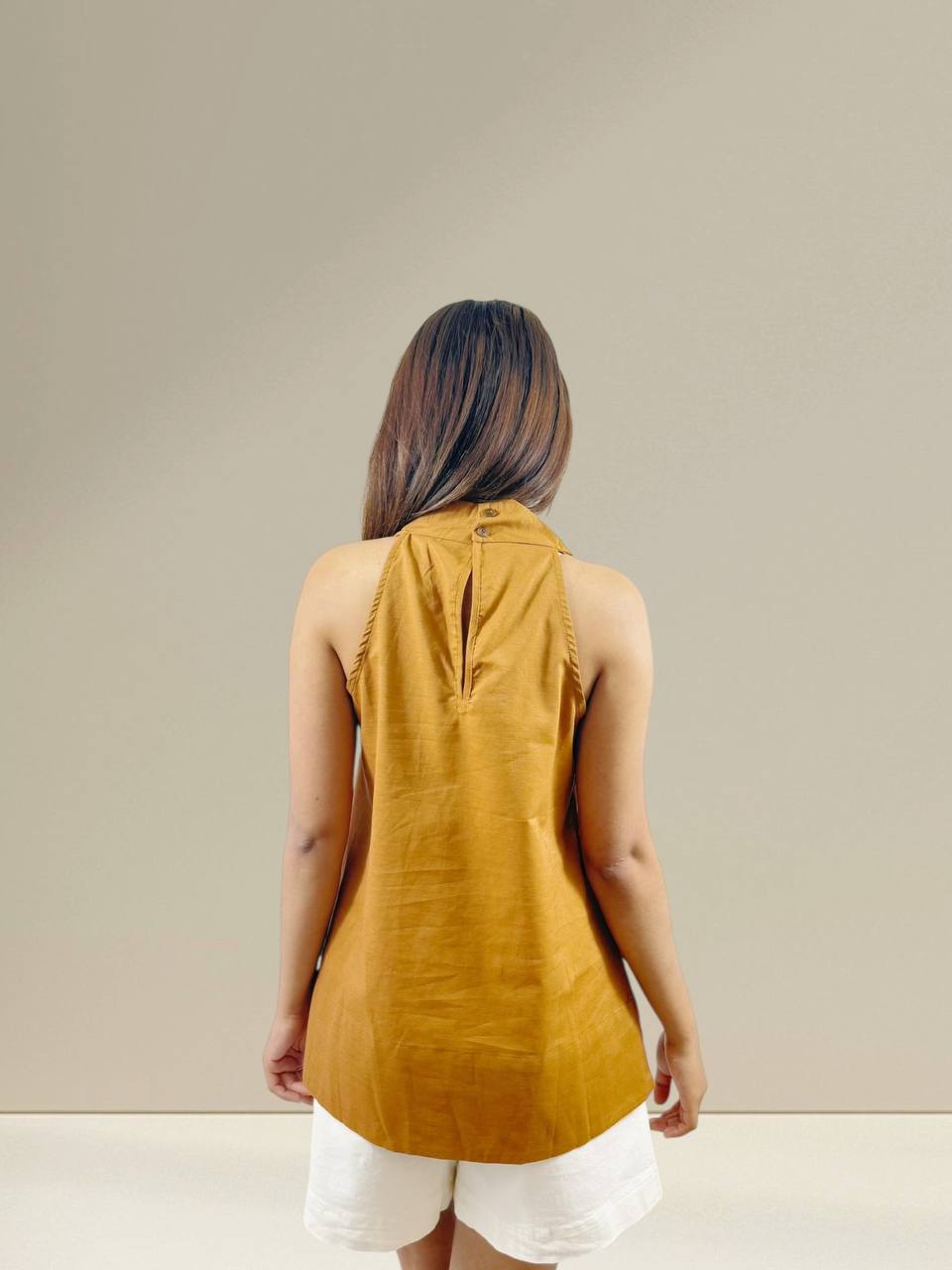 A relaxed sleeveless tunic designed for effortless everyday wear. Features a loose, flowy silhouette with soft gathers that offer comfort and ease of movement. Made from lightweight, breathable fabric, perfect to pair with skirts or pants for a casual and laid-back look. Suitable for daily wear and warm weather. Measurements : Bust: 90cm Length: 71cm IMPORTANT NOTE: The actual product may vary slightly from the images shown due to studio lighting and individual screen color settings.