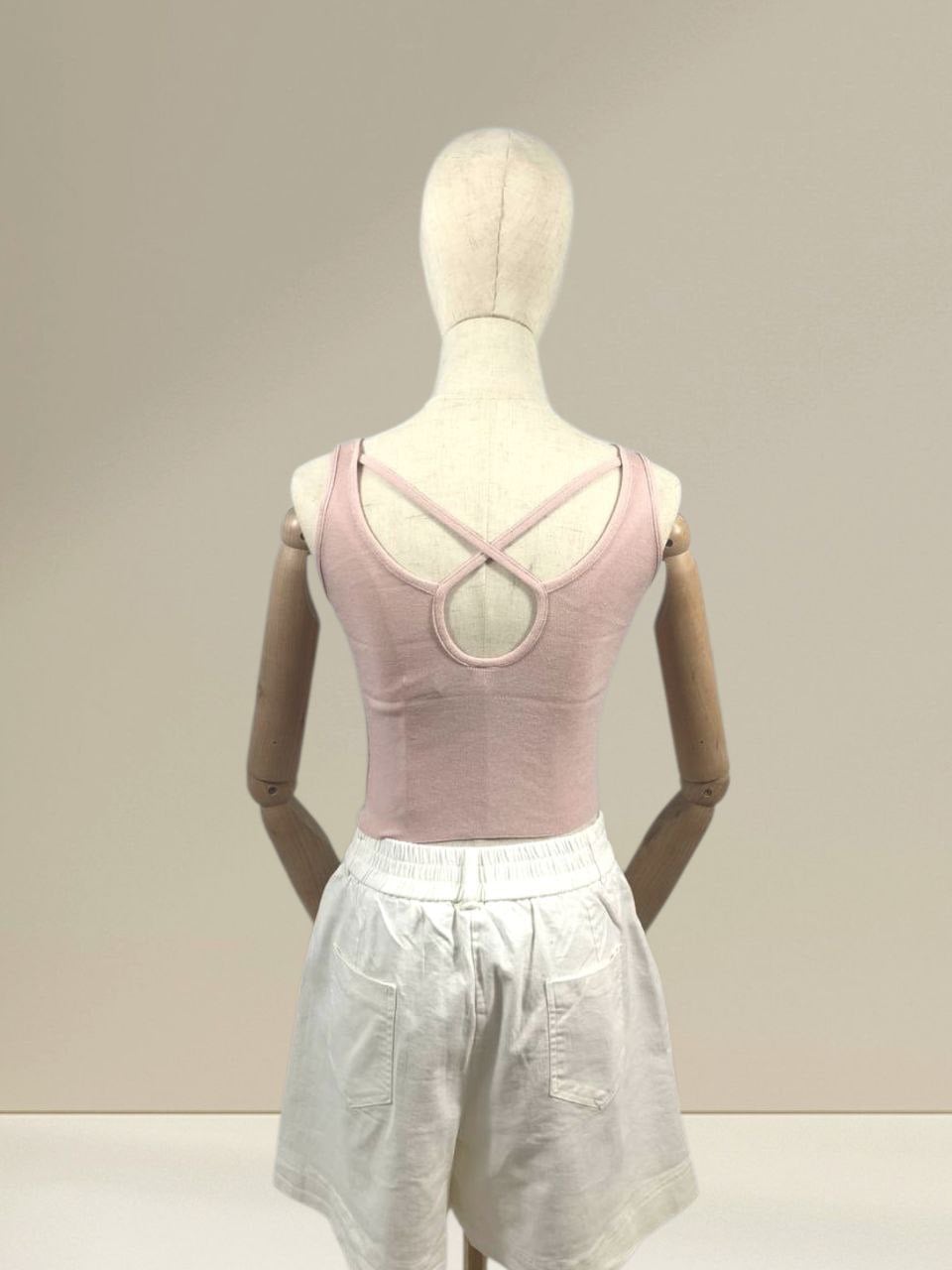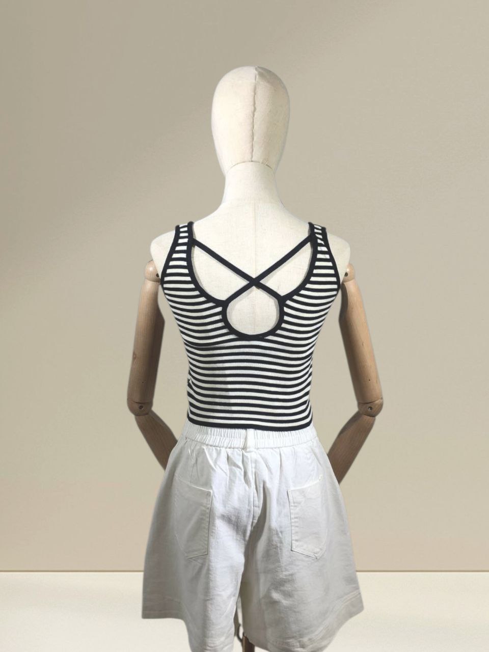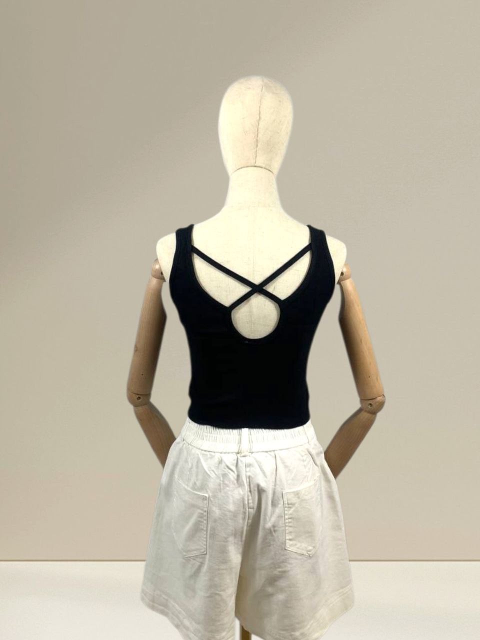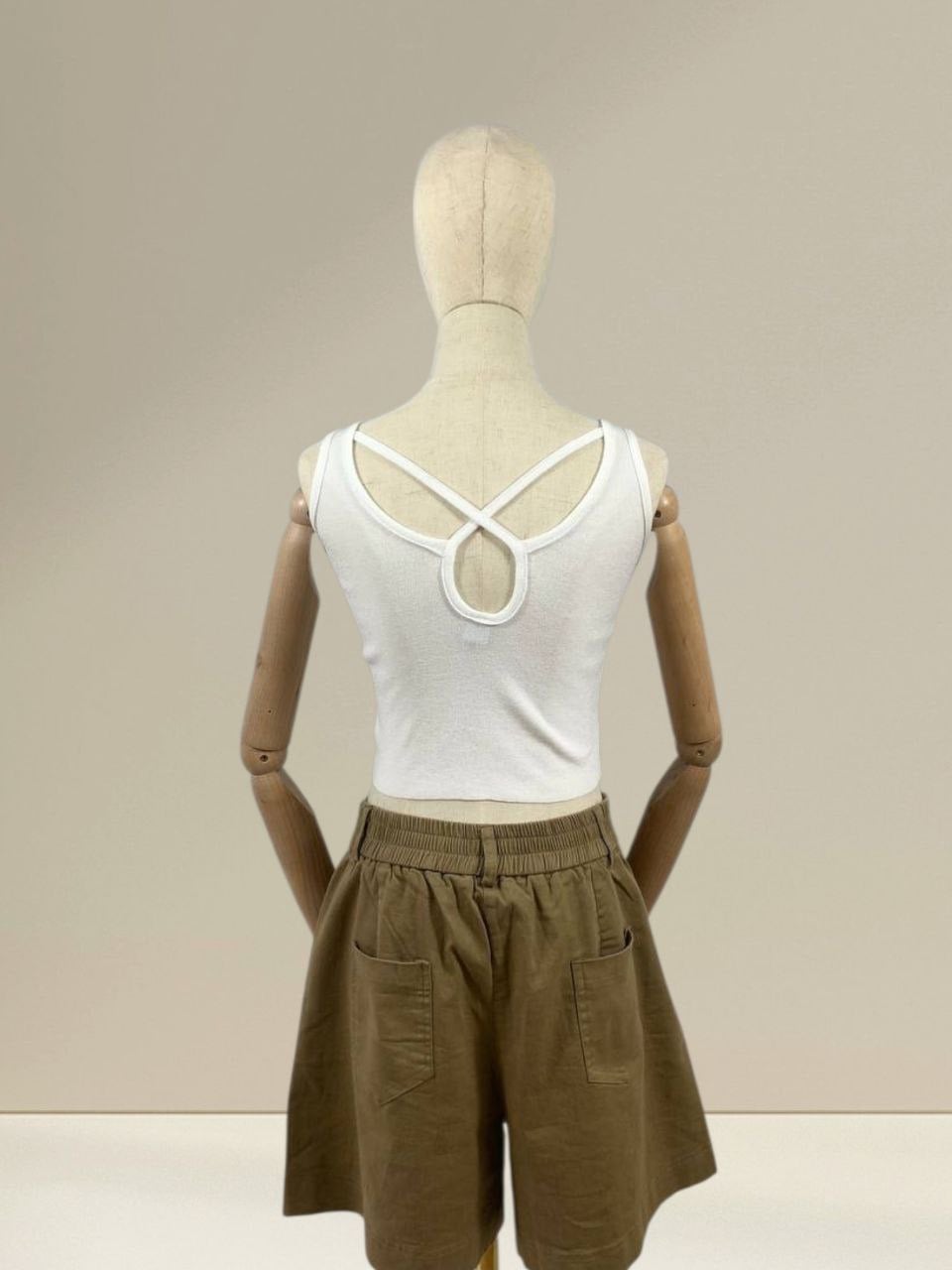 A stylish knit singlet featuring classic flattering cropped length. Designed with a square neckline and wide shoulder straps for a clean, modern look. The highlight is its elegant cross back detail with a subtle cut-out, adding a chic and feminine touch. Made from soft, stretchable knit fabric that fits comfortably and hugs the body beautifully. Perfect for casual days, beach looks, or effortless summer styling.
