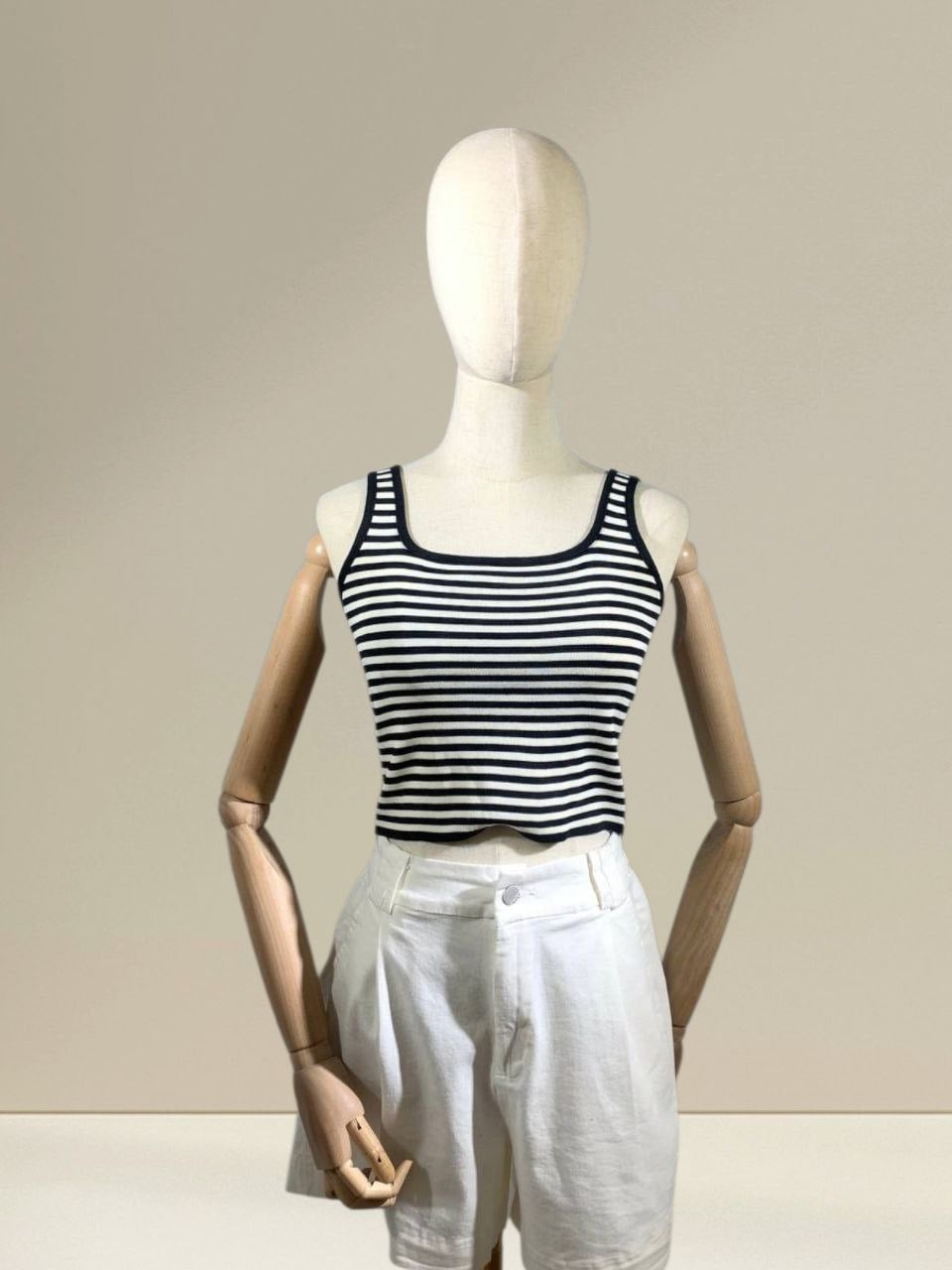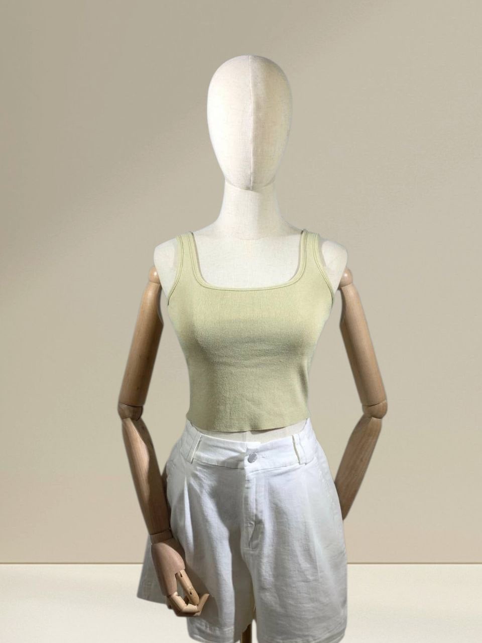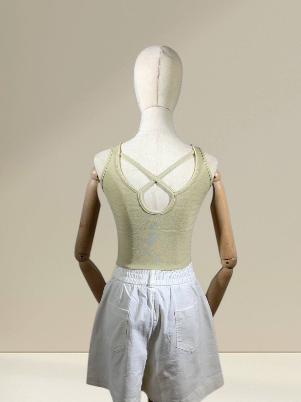 A stylish knit singlet featuring classic flattering cropped length. Designed with a square neckline and wide shoulder straps for a clean, modern look. The highlight is its elegant cross back detail with a subtle cut-out, adding a chic and feminine touch. Made from soft, stretchable knit fabric that fits comfortably and hugs the body beautifully. Perfect for casual days, beach looks, or effortless summer styling.