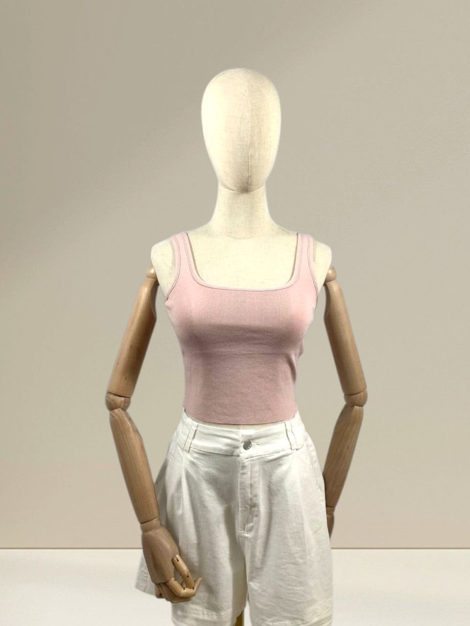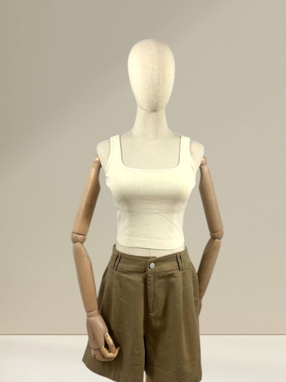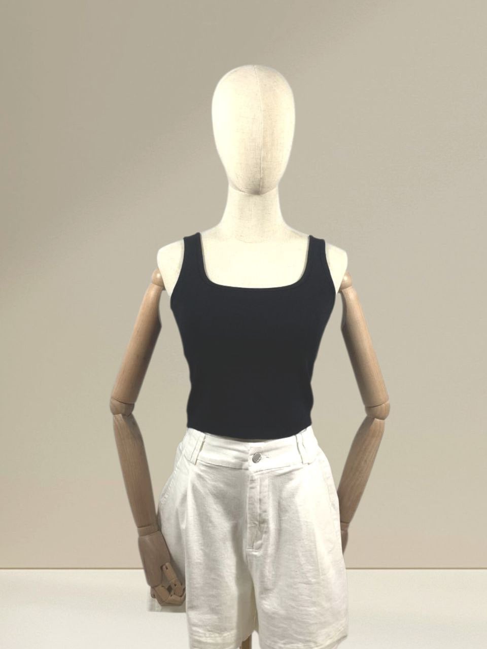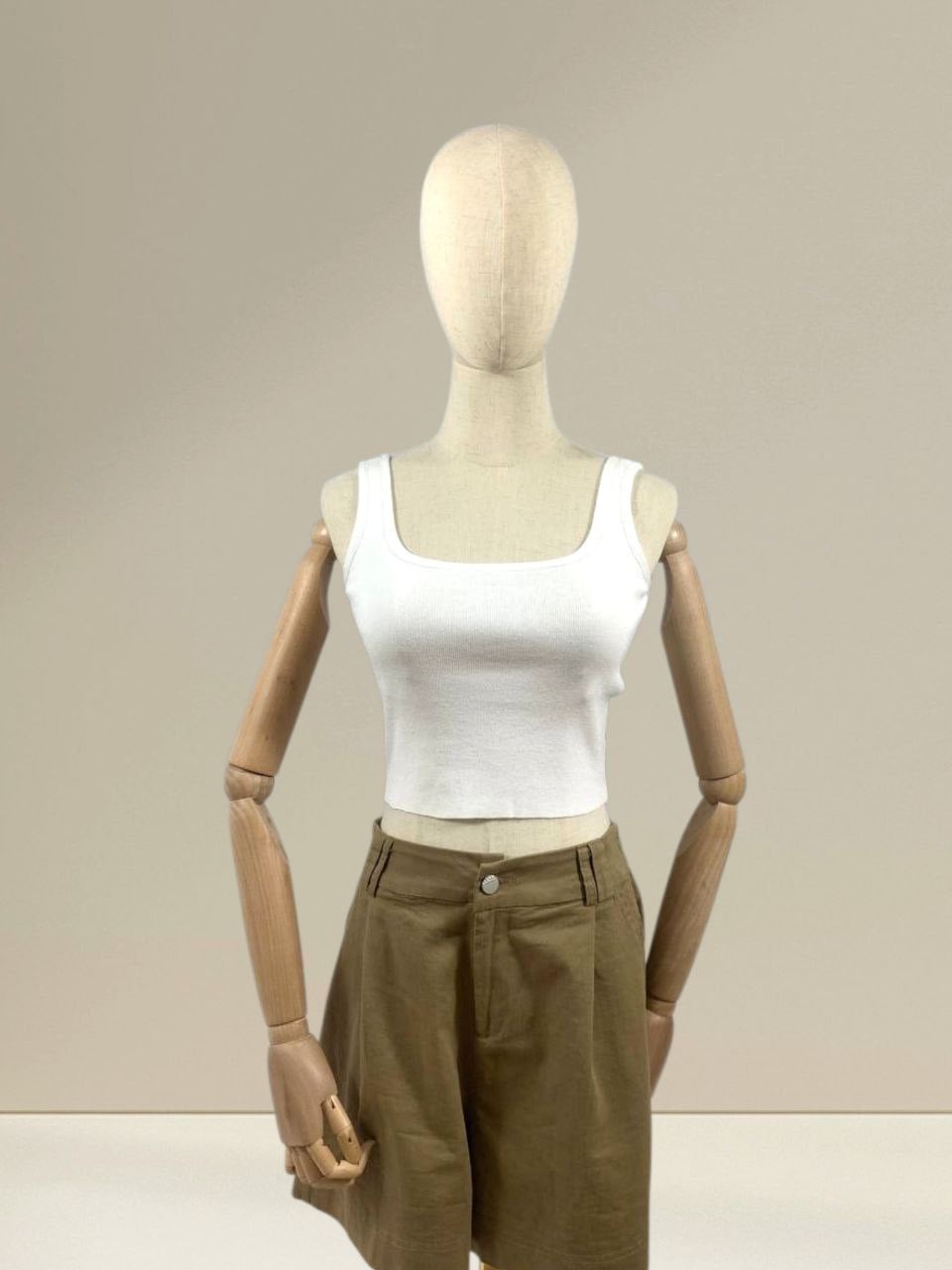A stylish knit singlet featuring classic flattering cropped length. Designed with a square neckline and wide shoulder straps for a clean, modern look. The highlight is its elegant cross back detail with a subtle cut-out, adding a chic and feminine touch. Made from soft, stretchable knit fabric that fits comfortably and hugs the body beautifully. Perfect for casual days, beach looks, or effortless summer styling.